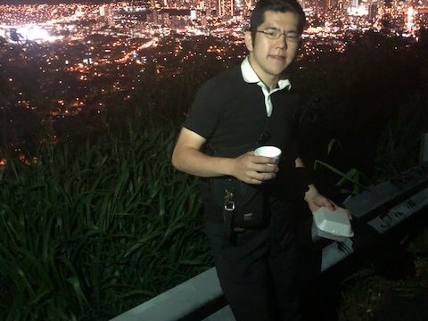日本語の滅茶苦茶上手いガイドにビックリしながらスーパーで買い物した後、マラサダを受けとってのんびり夜景を眺めながら記念撮影しました。