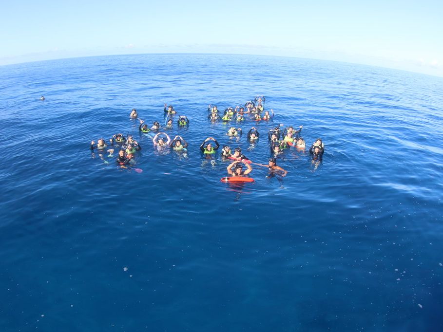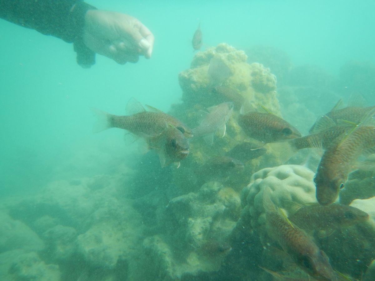 その後は1時間ほどのシュノーケリングで、まれにウミガメを見ることができるそうですが、今回は見ることができませんでした。ただ、魚がいろいろと群がっており、あっという間に時間は過ぎていきました。