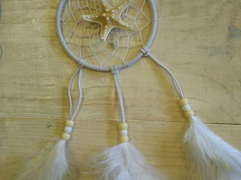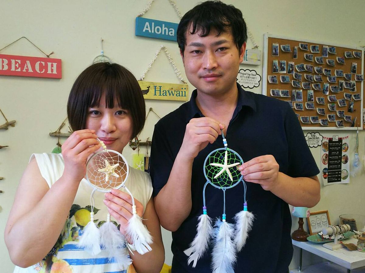 最初は、難しいのかと思ったんですが、やさしい先生が丁寧に教えてくれて、意外と簡単に作れました。リング、糸、羽の色やビーズ、ヒトデが自由に選べて、お気に入りのドリームキャッチャーができました。