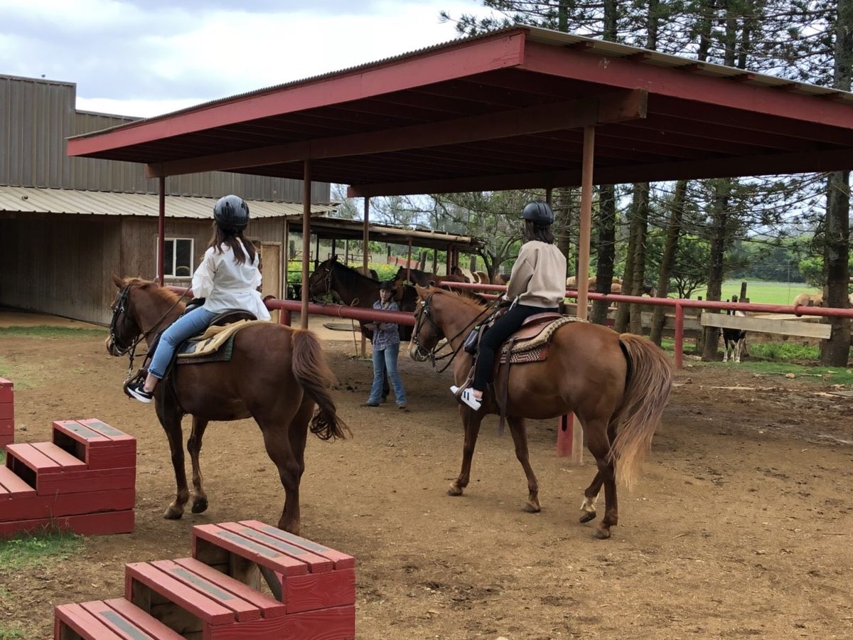 アラモアナセンターから55番のバスに乗り、到着までは約2時間弱程でした。降りるバス停は地図で確認しながら向かい、降りる時に運転手の方に教えてもらいました。乗馬体験をしたのは2人で、1年ほど前にクアロアランチで乗馬を体験しました。ガンストック牧場の方が時間が長いプランがあったので今回はこちらを選ばせていただきました。馬はとても扱いやすく、時々言うことを聞かない時がありましたが、ガイドの方がすぐにヘルプをしてくれました。山の頂上まで登ると、すごく景色が綺麗で、記念写真を撮ってもらえて大満足です。また機会があったら体験したいです☺︎︎