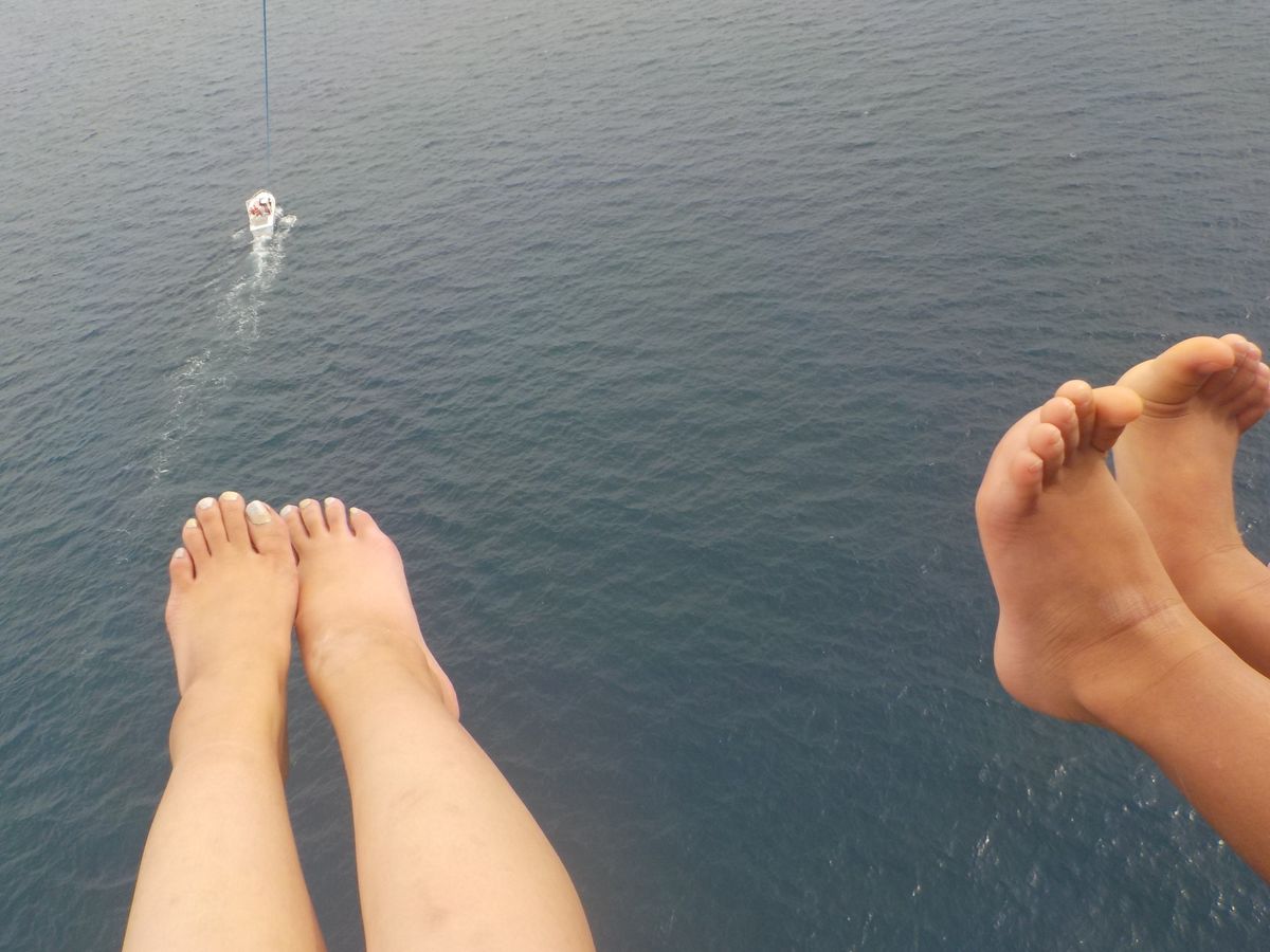 パラセイリングが終わる前に、海に足が浸かるようにしてくれます。人をみて加減してくれてて、私たちは、一回浸かっただけでしたが、カップルは二回、男子大学生?のグループは、身体まで何回かポチャンしてもらってて、見てる私たちも楽しませてもらいました。