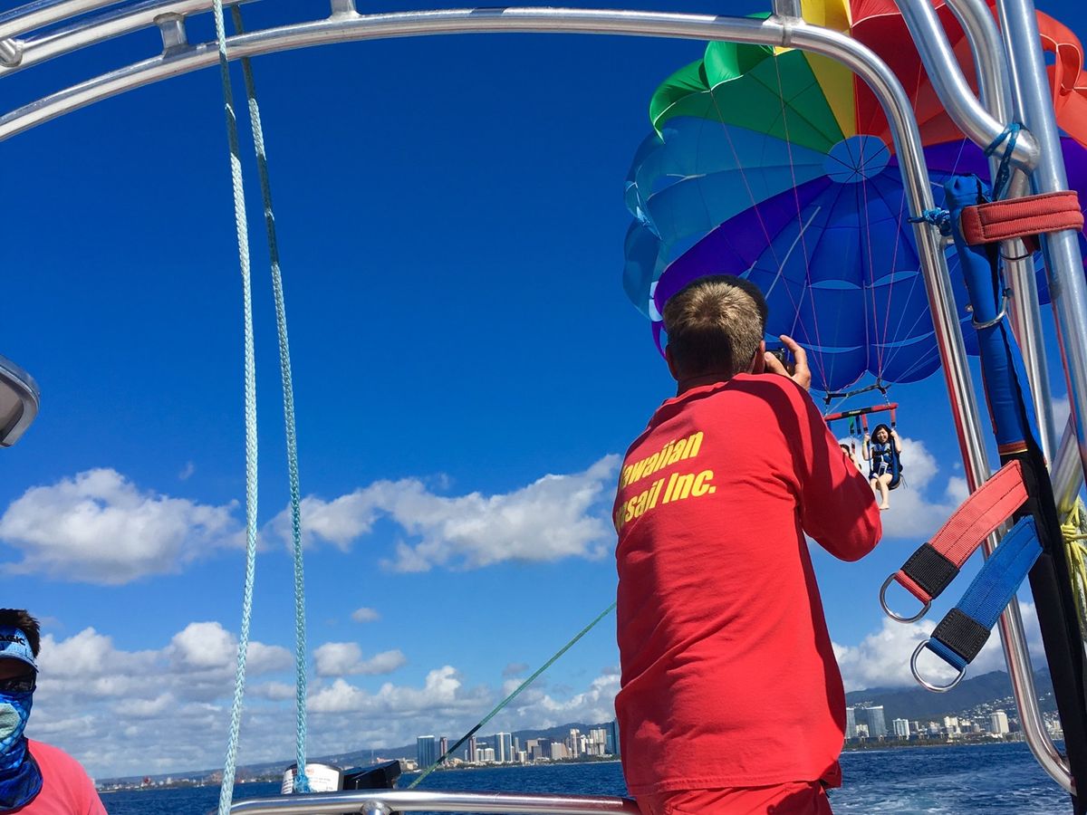 パラセイリング中は、沖から眺める水平線、ダイヤモンドヘッド、飛行機、など景色が楽しめて、爽やかな風が気持ちよく最高の体験でした!