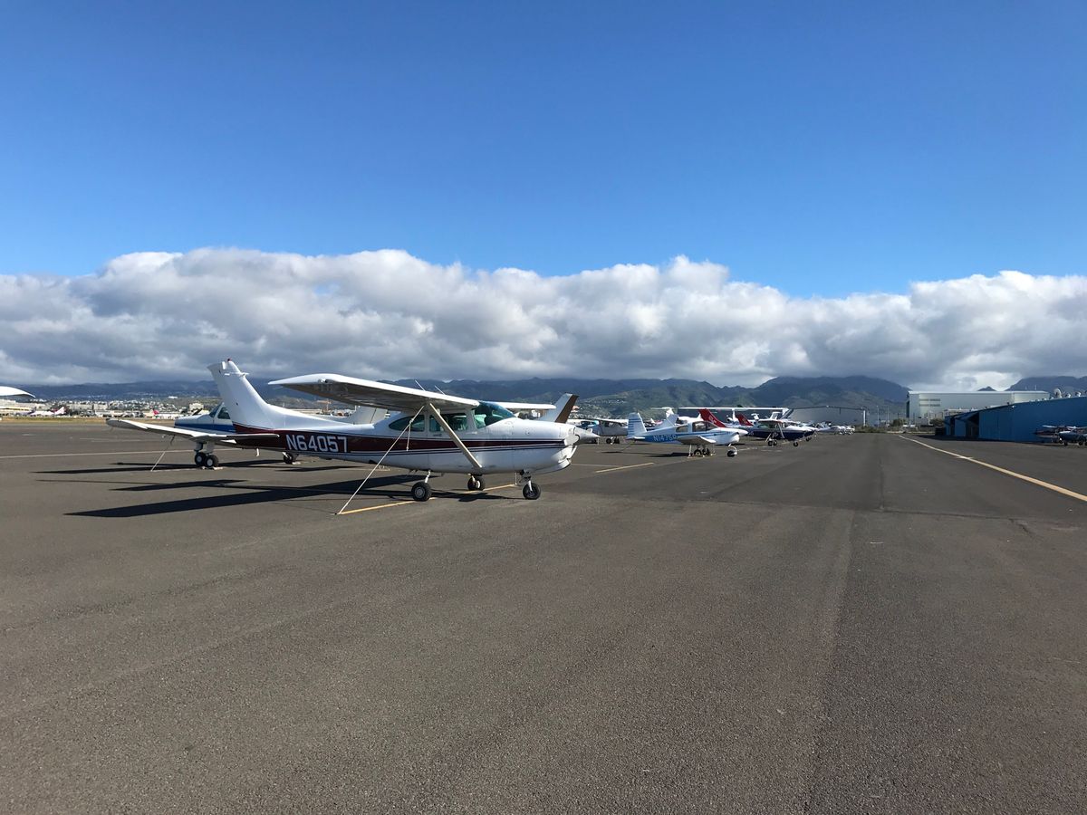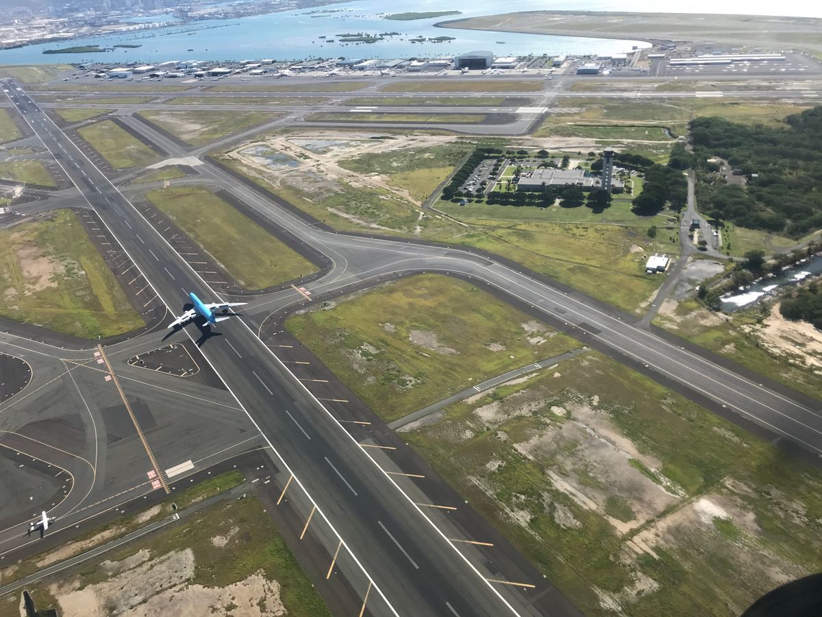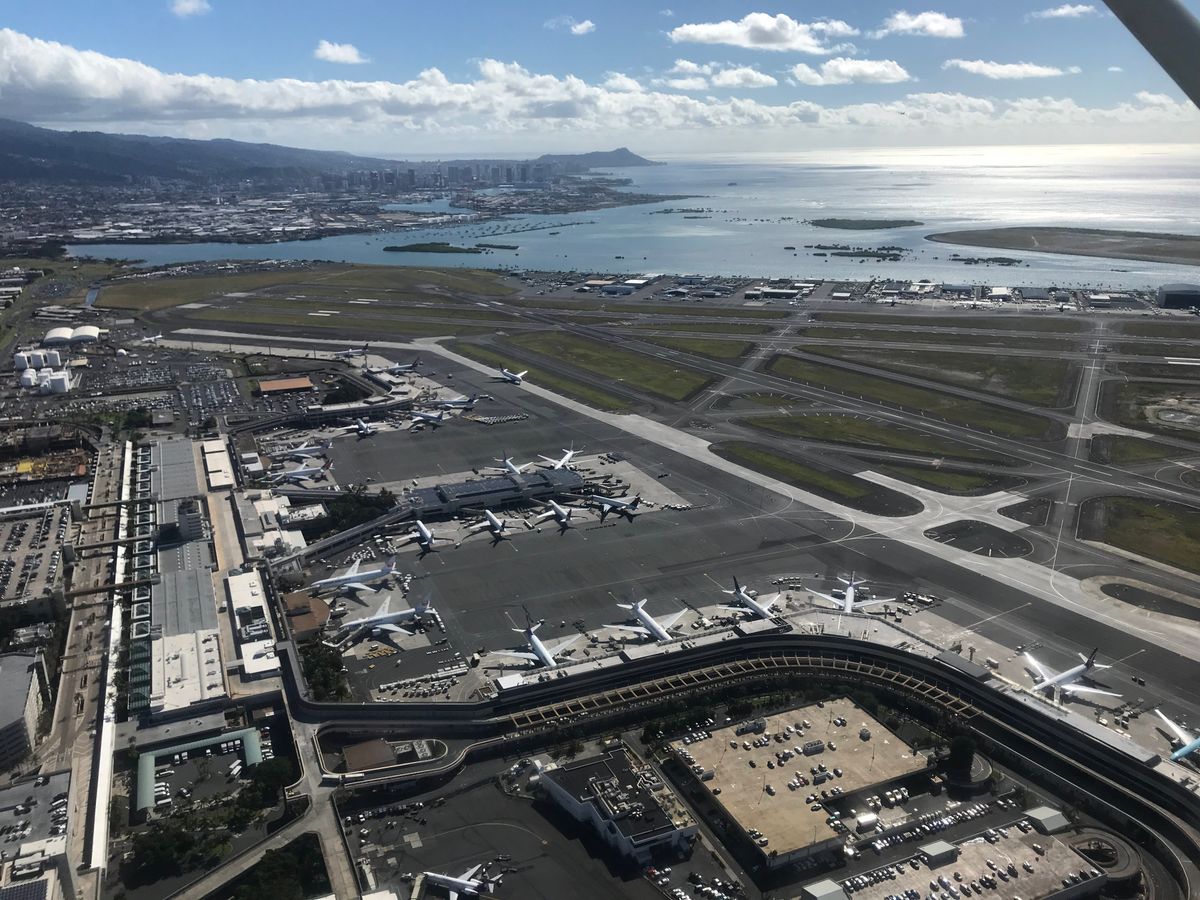 ホノルル空港の滑走路内を歩いてセスナまで行きます。