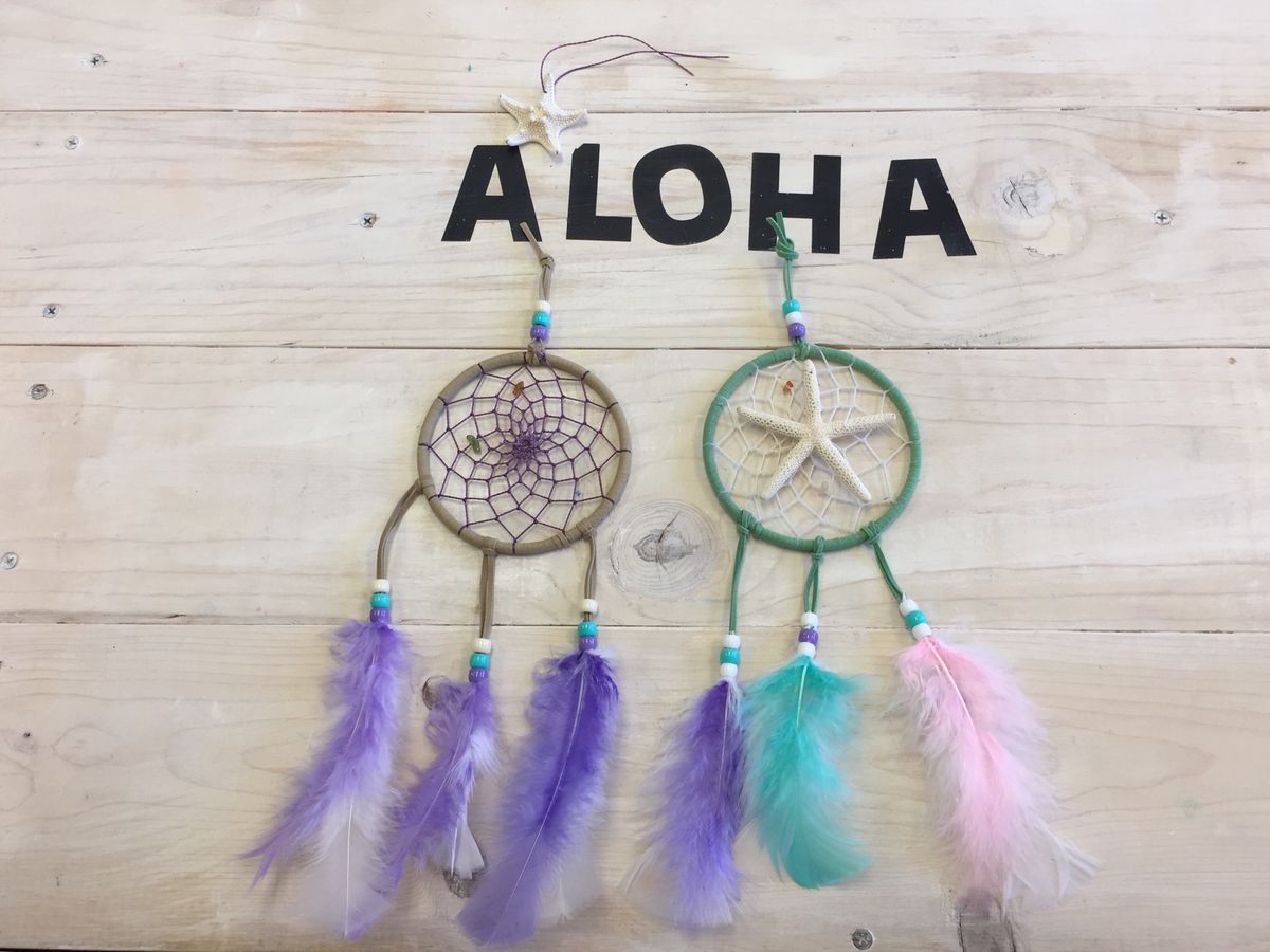 初めは、ちゃんと出来あがるか不安でしたが、先生がとても丁寧に優しく教えて下さるので、あっという間にに綺麗に作る事が出来ました。糸やビーズ、羽等の色合い、配置等いろいろ考えながら自分好みに作る事ができるし、手作りなので良い記念になりました!旦那さんが、あたふたしつつも、なぜか糸を張るシーンでやたら上手く面白かったです。作りながらの先生との何気ない会話も楽しく、旦那さんもとても楽しかったと言っていました!日本に帰宅後は、旦那さん共々自分の作品を自画自賛しあっていて(笑)、一番目立つ所にどちらの作品を飾るか未だに競い合っています。店内には、いろいろな可愛い作品がたくさんあり、どれも気になるものばかりでした。ハワイに旅行した際には、是非またお邪魔したいです♪ 先生、お世話になりました、ありがとうございました!