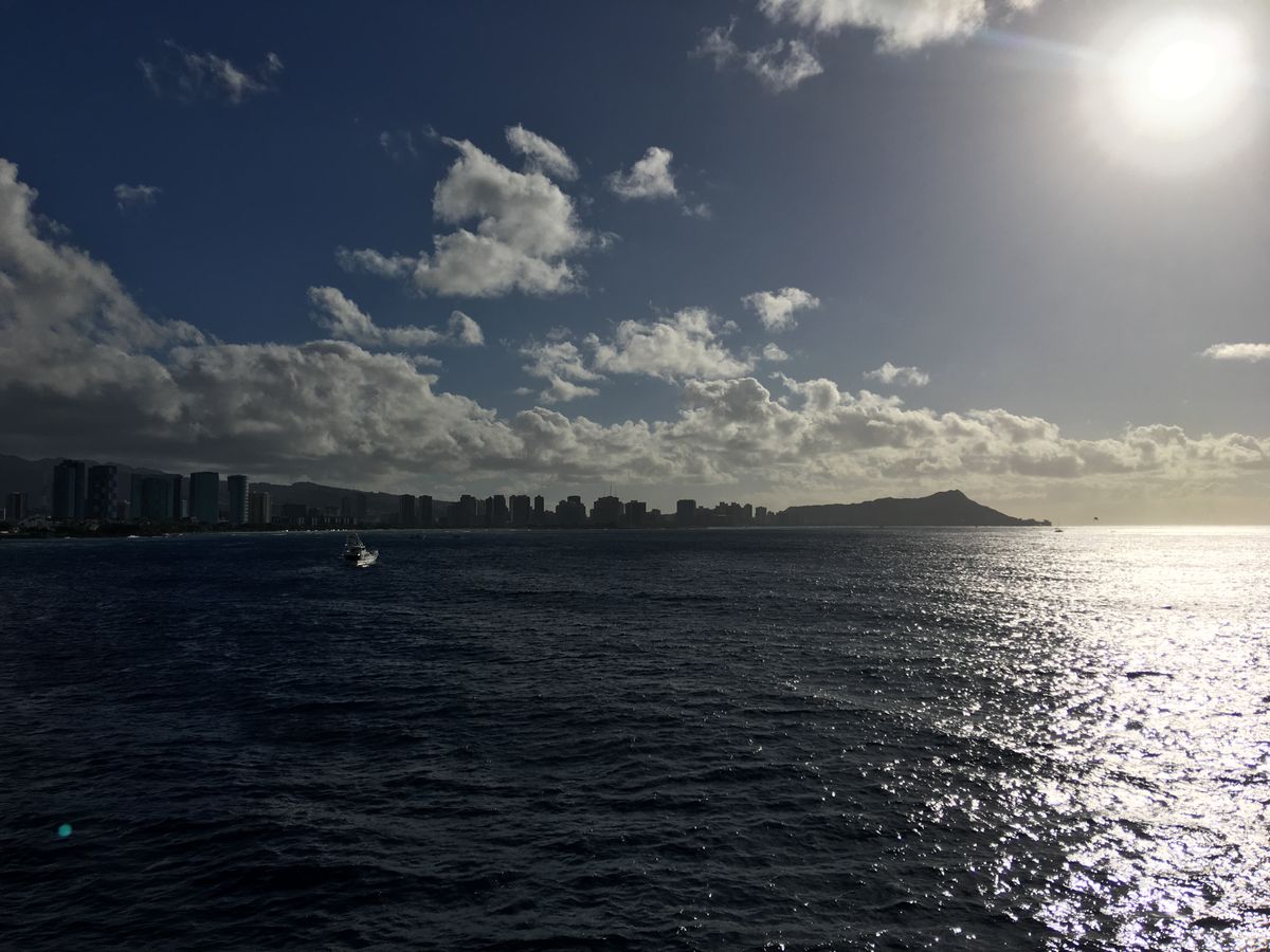 朝からアロハタワー集合です。送迎は14ドルかかりますのでTHE BUSで行きましたが問題なく行けますよ。一瞬クジラは現われたようですが、船の場所の関係で見れませんでした。それでも、ダイヤモンドヘッドやホテルの美しい景色は楽しめました。残念でしたが・・・