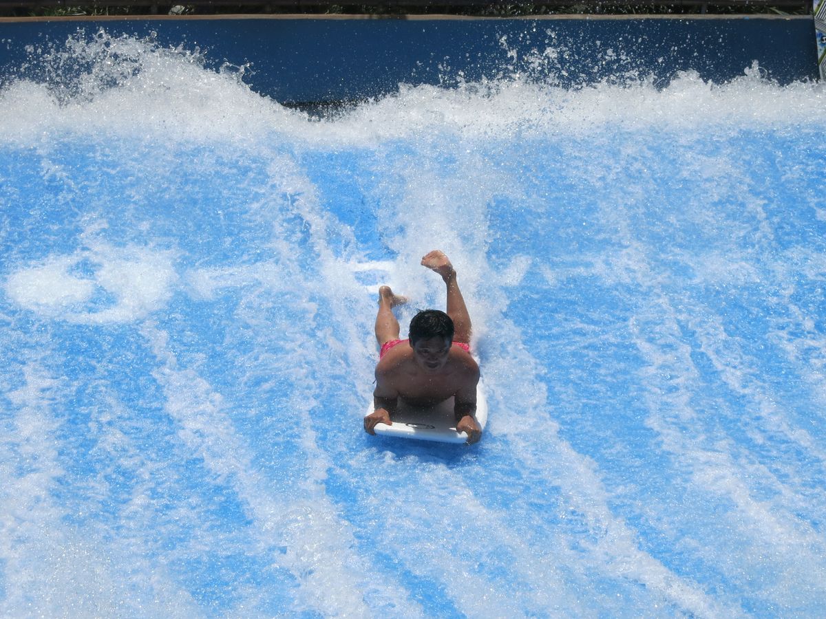 +5ドルでサーフライダー一日乗り放題にしました。(インフォメーションで受け付けしてるので入場してから自分で申し込みます)自分としてはこれが一番面白かった。まったくの初めてで、以前テレビでアンガールズがやってたようにハプニング映像になるのかなぁとやる前は不安でしたが、40過ぎのおじさんでもわりとフツーにというか、以外に簡単?おススメです。