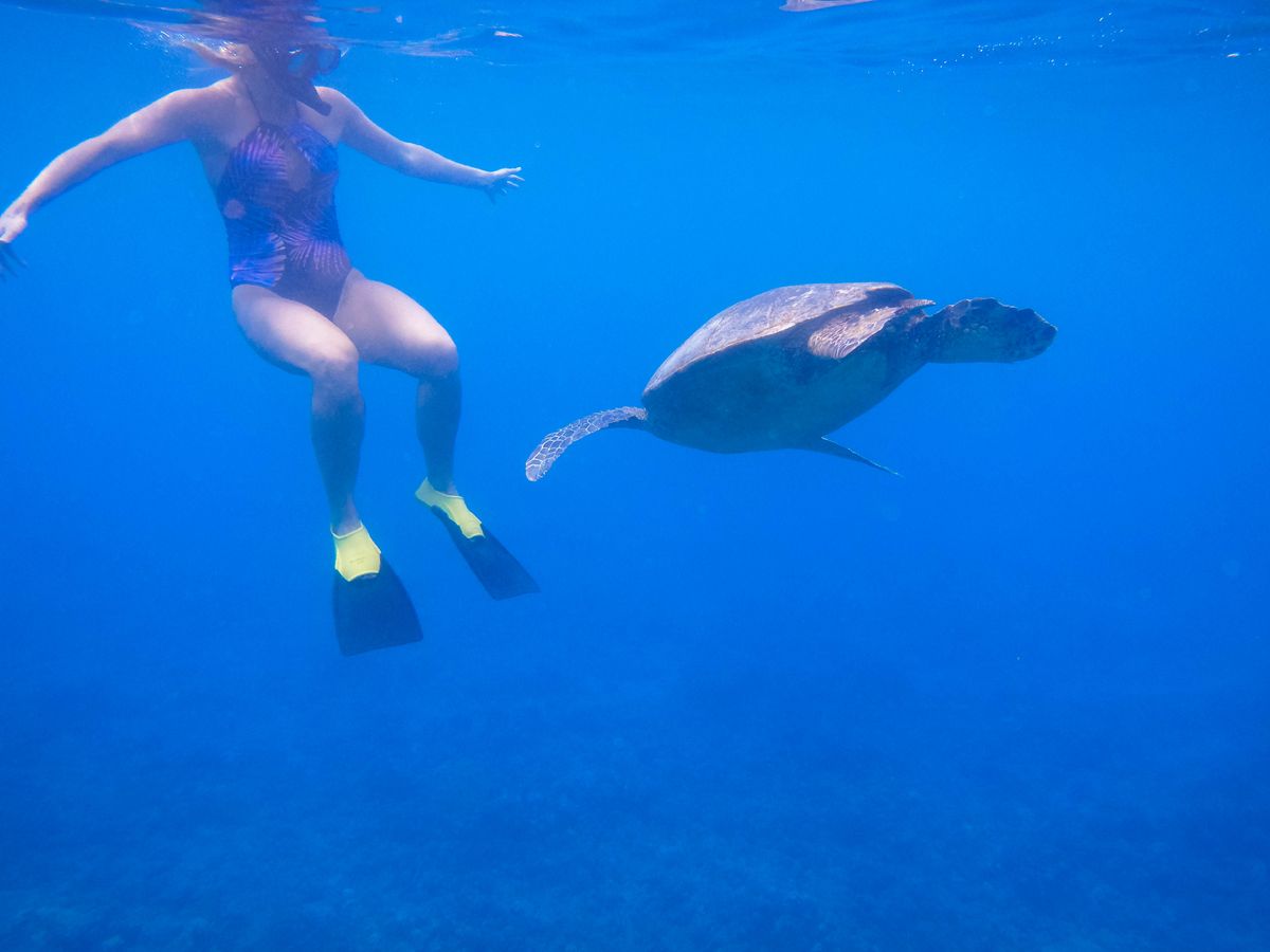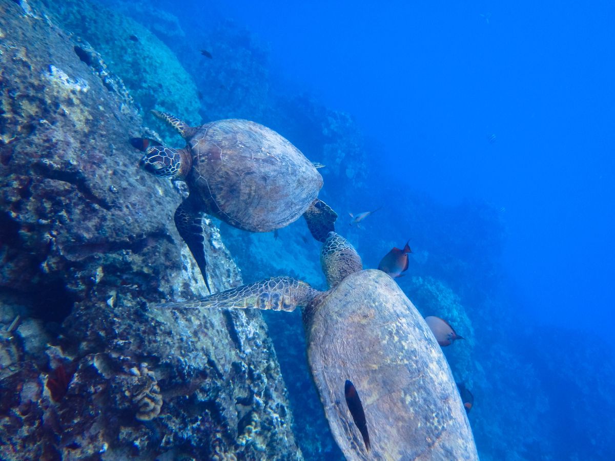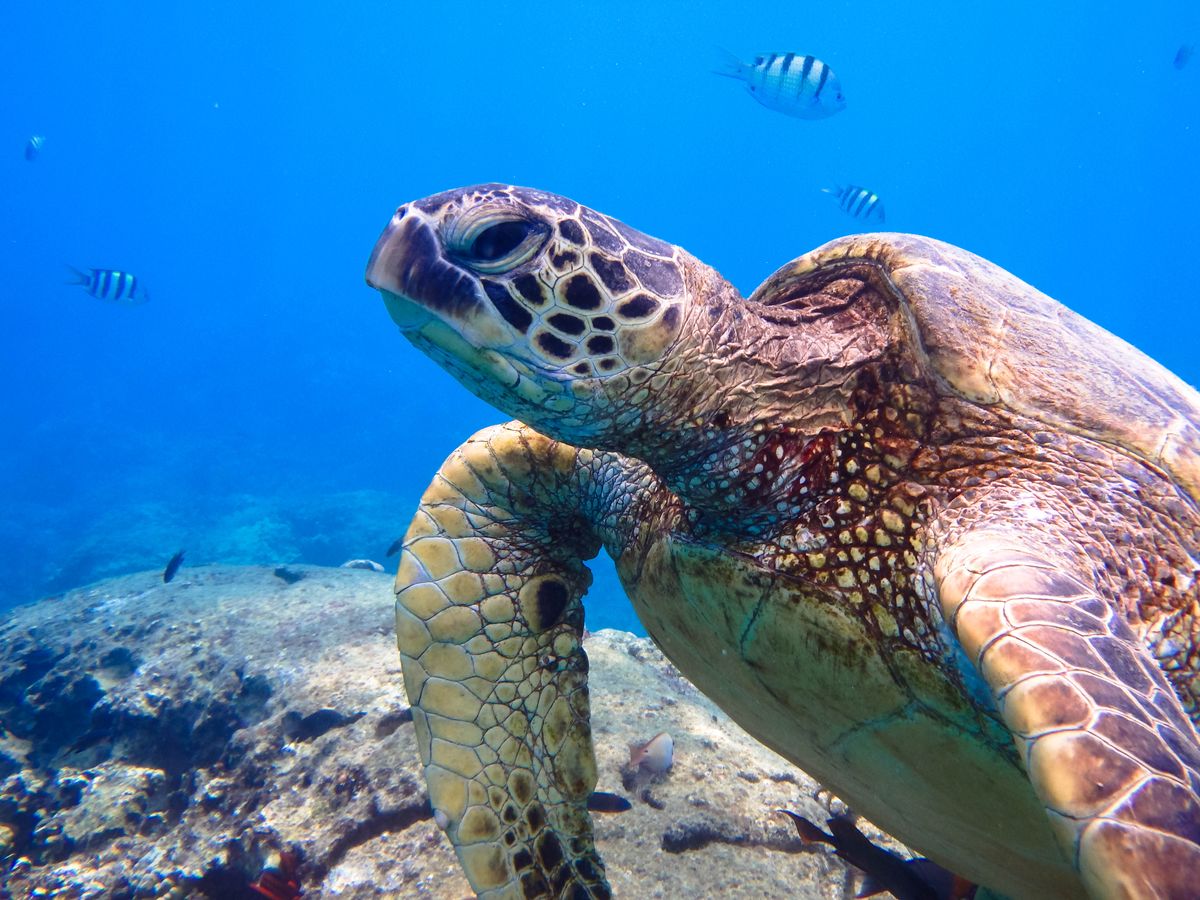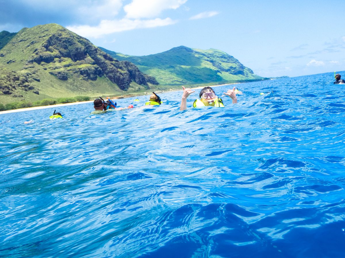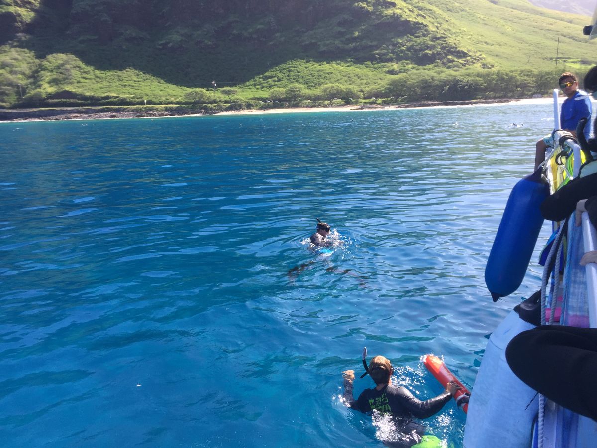 お次は船長のウクレレと生歌を聴きながらホヌウォッチングへ!運よくビッグなホヌがボートの前で迎えてくれました。その後は大きなサンゴの沖合でシュノケーリング!シュノケーリングの前には日本人ガイドさんから安全に関わる大切な諸注意を分かりやすく丁寧に説明してくれてとても安心しました。いざ、足ヒレ、マスク、ライフジャケットを着用して着水!透明な海の中にはたくさんの魚とサンゴがいて沖合ならではのシュノケーリングを楽しむことができました。他のお客さんはホヌと泳ぐことができたそうです。羨ましい!また、現地スタッフの方々も安全面に目を光らせていて安心して楽しむことができました。大満足なtourでした!