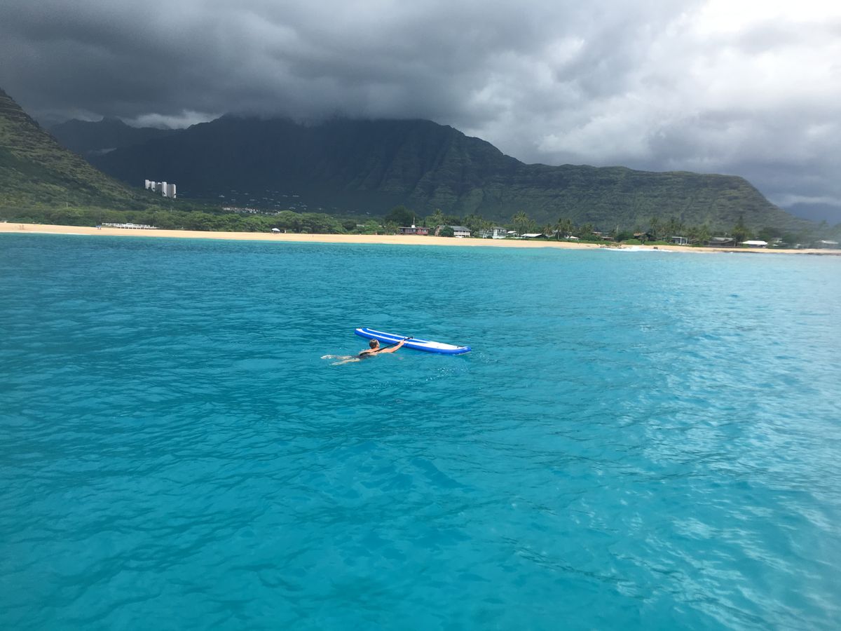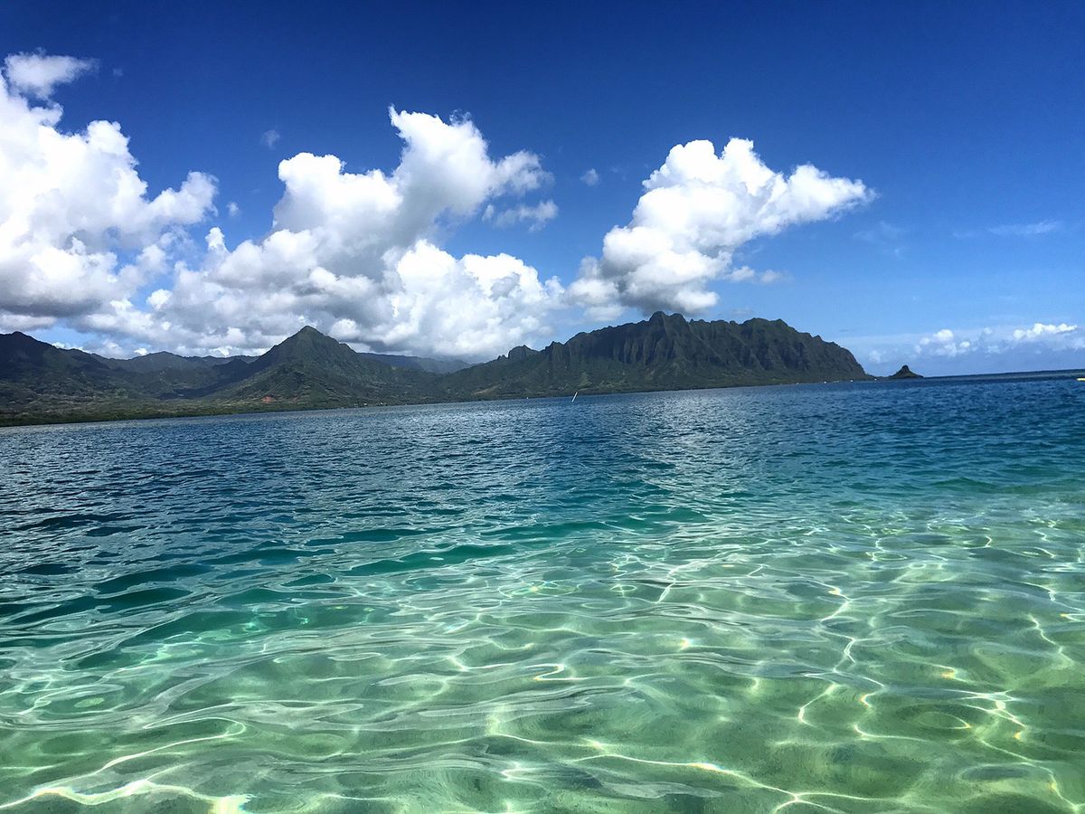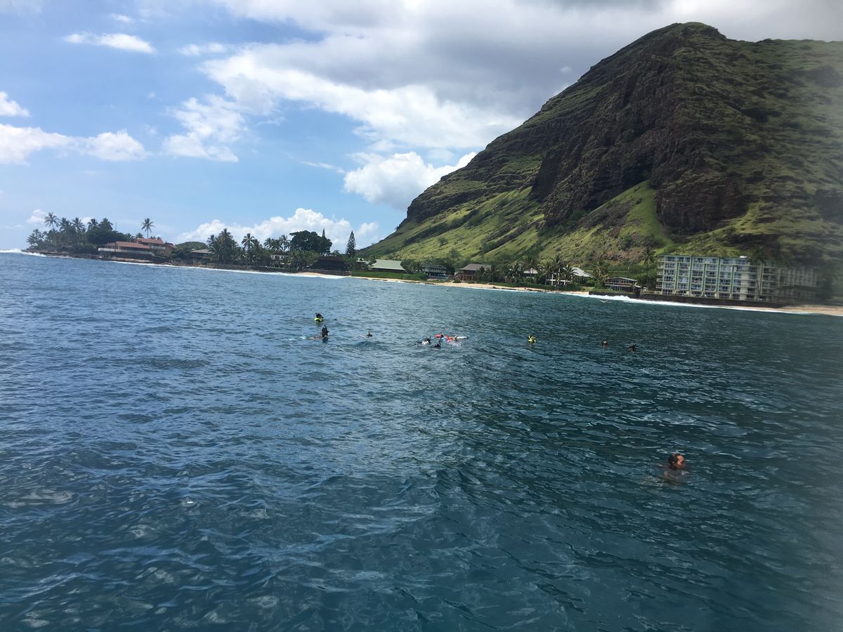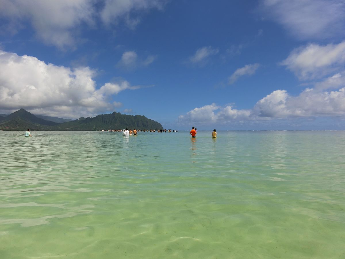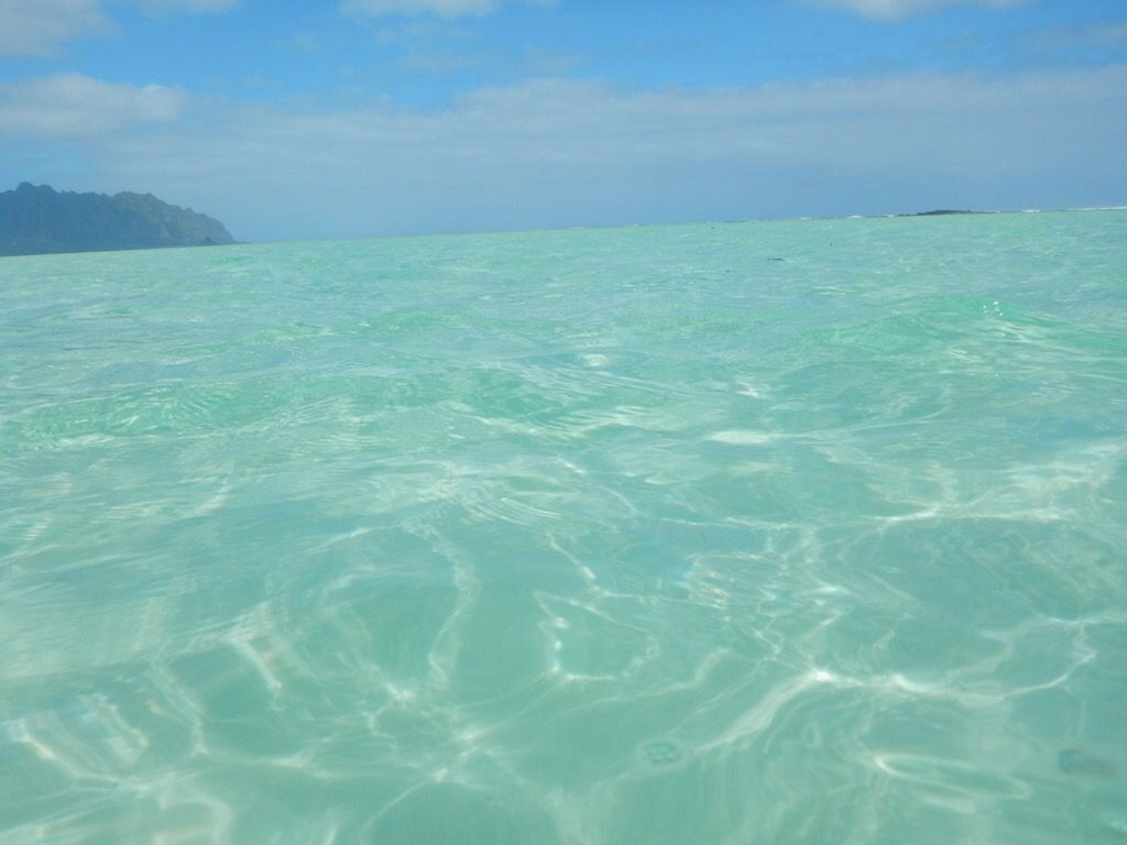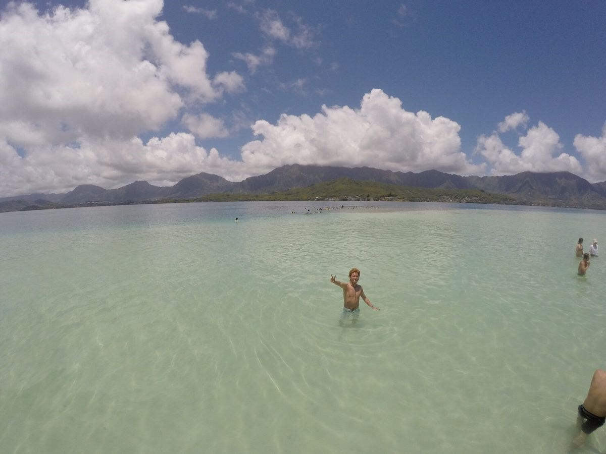 ワイキキからバスで到着後、ボートで出発!日本人の元気なガイドさんから冗談交えての観光ガイドもしてもらいながら天国の海へ到着!満潮で腰までつかるほどで、青い海とクアロア山脈とサンドバーのエメラルドグリーンのコントラストが最高でした。1時間ほどサンドバーを堪能した後はランチtime!ボートのBBQで焼きあがった出来たてのハンバーガーはとても美味しかった!