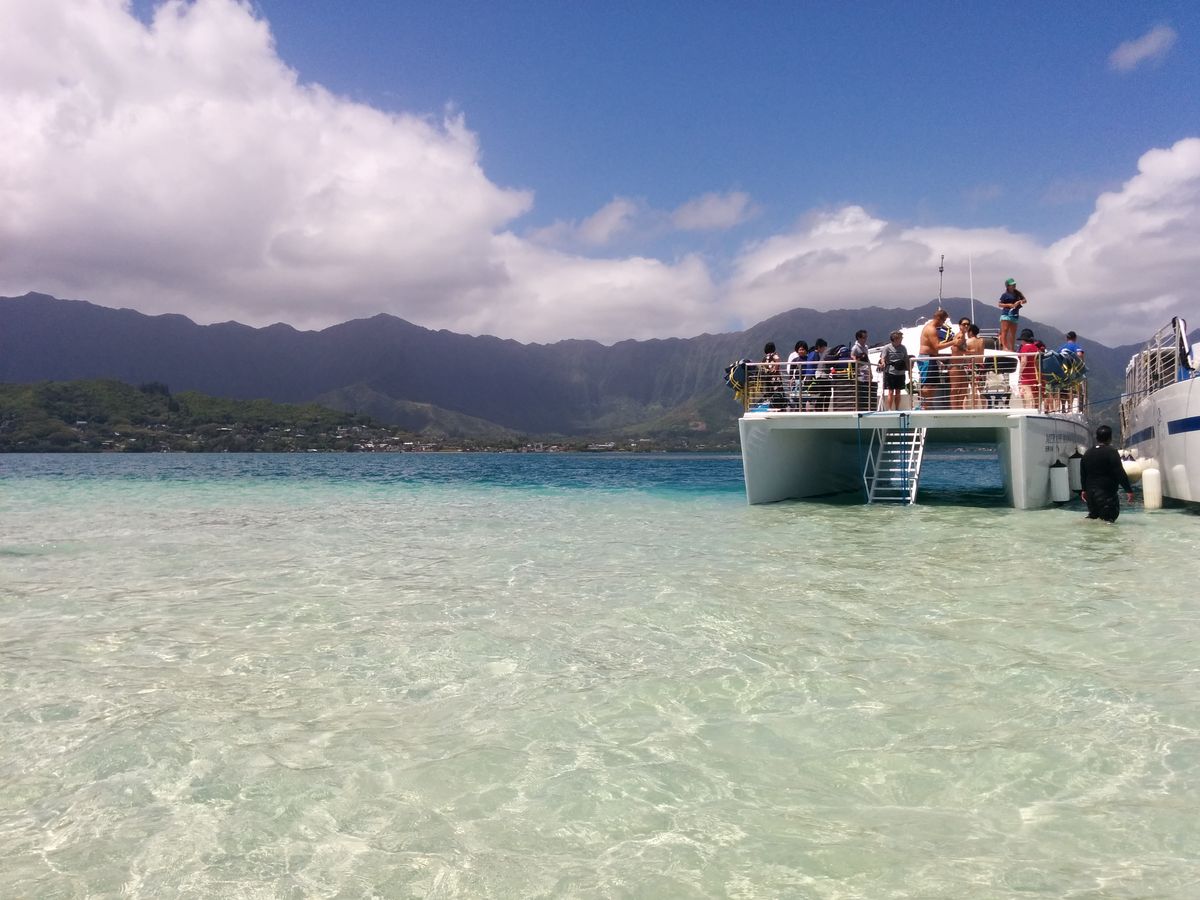 カイルアのコンドミニアムに滞在していましたので、送迎無しで現地にレンタカーで行きましたが、ツアー参加とは違い、現地について誰もいない状況だったために、集合場所がこの場所で合っているのか?どの船だ?と現地到着時から船が来るまでの感、心配でしたが・・・。何か目印があると良いなと思いました。
