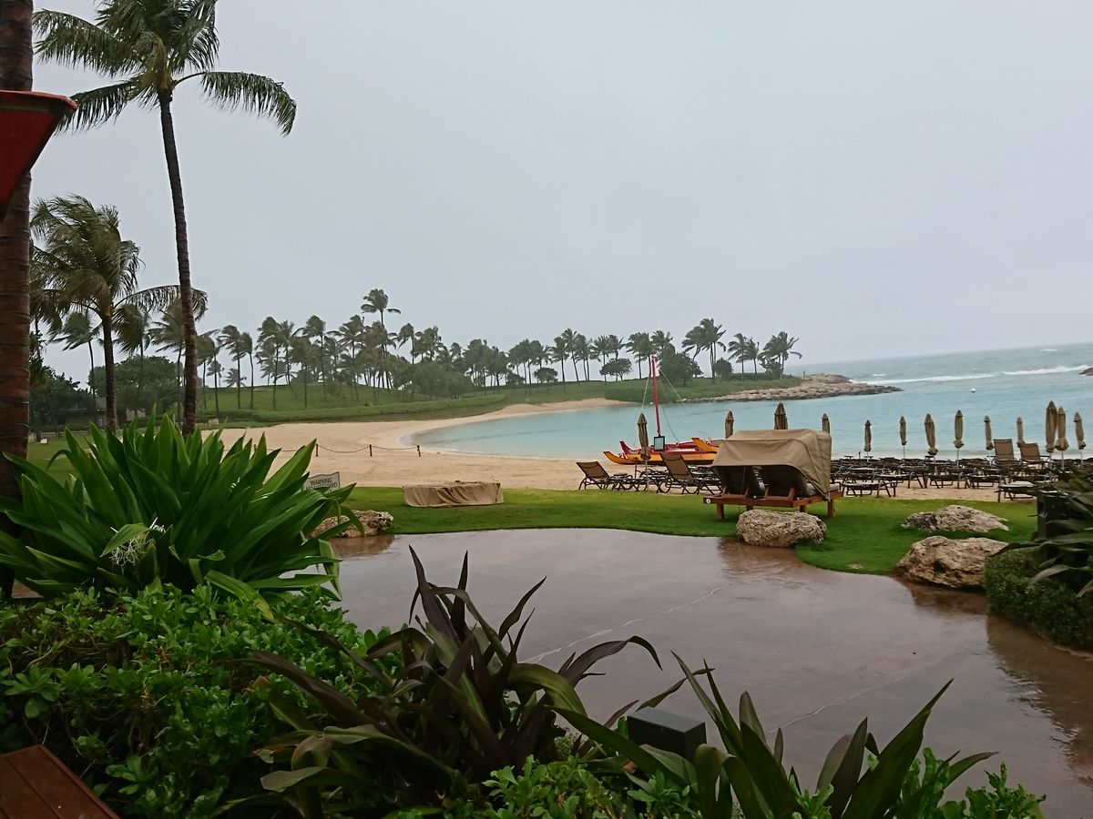 予約代行を頼んでいたマカヒキレストランでちょうど朝ご飯を食べ終わる頃に降り出した雨がやがて大雨に