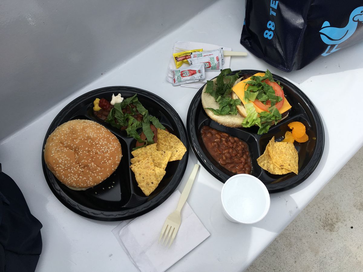 船に戻ると船長お手製のハンバーガーや、スナック、ジュースが配られ腹ペコの私たちは完食しました。ですが半分近い方がグロッキーで、食べ物はお持ち帰りされていました。