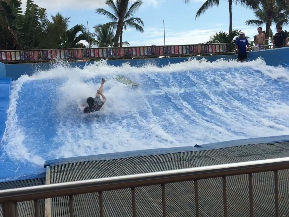 10代以上の男性に人気だったのが、入園料とは別料金だが、ザ・フローライダーという、人工的につくった高速で水流の上で、ボディボードや小さめのサーフィンを楽しむアトラクション。参加するにはパスポートのコピーとケガの自己責任承諾、あとは10ドル(ボディボードは5ドル)を払い、専用のリストバンドを付けると参加出来る。一度リストバンドを付けるとそれ以降は何度でもトライ出来る。一人6分ぐらいのプレイ時間で、参加希望者は列の最後尾に並び、自分の番になれば、どちらのボードを使うか選びトライする。