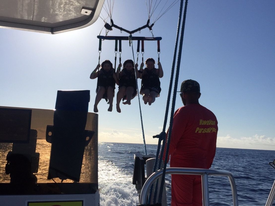 女友達と一緒にハワイに行き、パラセーリングしました。バスの待ち合わせ場所には明るい運転手が来てくれ常に笑わせてくれました!そして現地には気配りして盛り上げてくれるアドバイザーがいたので安心して乗ることができました。またハワイいったらやりたいです\(^^)/