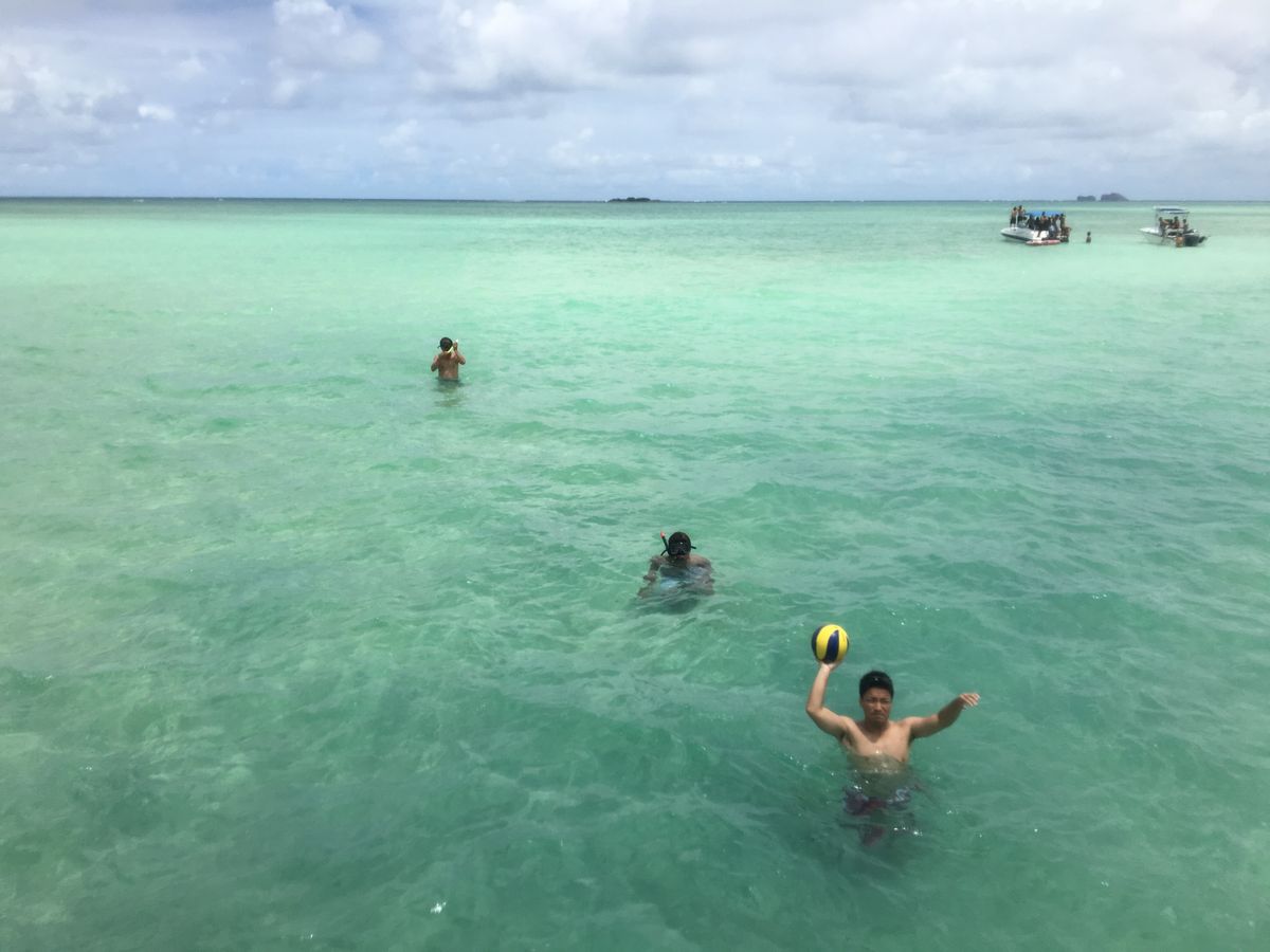 風が強い割に透明度出てますね。とお姉さんの言葉。本当に綺麗な海でした。バーでは周り濃い青の海なのに自分たちのいる場所だけが膝下で貴重な体験でした。お姉さんにバッチリのショットを沢山撮っていただきました。