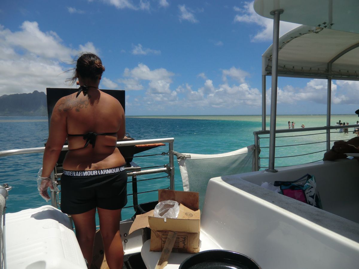 今回は参加人数が多かったということもあってハーバーから出航時には英語船と日本語船と分かれていました。日本語船は当然ながら日本語オンリーです。日本人の若い女性スタッフさんがいろいろな注意事項や説明などもわかりやすく教えて下さいました。サンドバーではスタッフさんがいろんなポーズで写真を撮って下さって大満足でした。