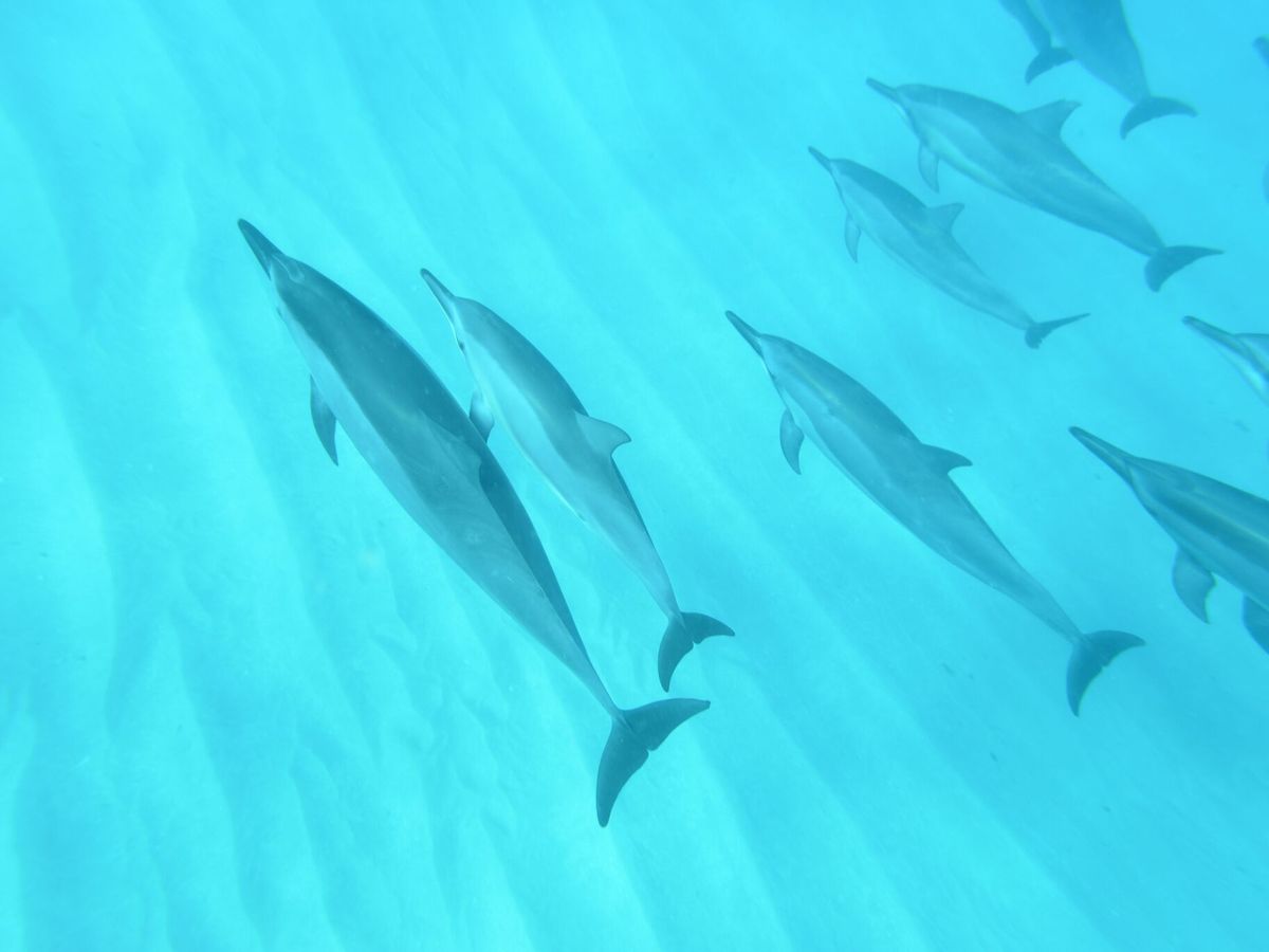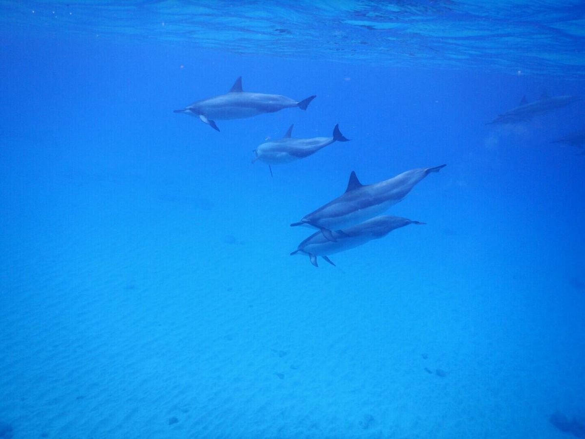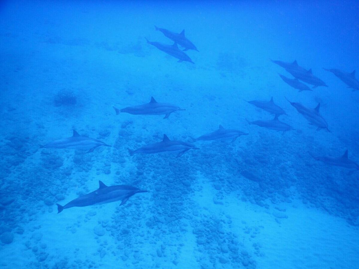 船からダイブし、水面に顔をつけると30頭近くのイルカの群れが。