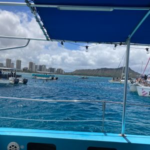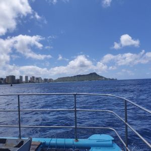 車で港へ向かい、船に乗りました。船に乗っている間は、お菓子と水を配られ、シュノーケルの装具の付け方の説明がありました。船内ではダイヤモンドヘッドがよく見え、スタッフの方が写真を撮ってくださいました。酔うかと心配していましたが、薬を飲んだおかげか、景色が綺麗だったからか大丈夫でした。