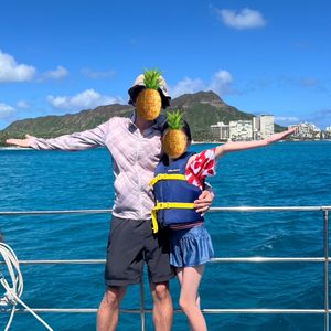船に帰還してダイヤモンドヘッドを背景に写真撮影し温かい飲み物をもらい帰港、生のウミガメを見る事が出来てハワイでの目的の1つを達成出来ました。つぎはイルカかマンタを見に行きたいですね!