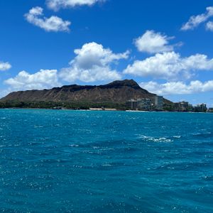 ダイヤモンドヘッド沖に船を浮かべてカメ探し。