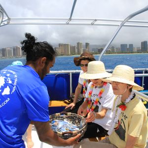 カメ大学はワイキキ沖にてシュノーケルやアクティビティーをお楽しみいただけますが、ボートの上で景色を楽しみながら船の上でのんびり過ごしていただけますので、小さなお子様がいらっしゃる場合やご高齢の方にもご参加いただいております。