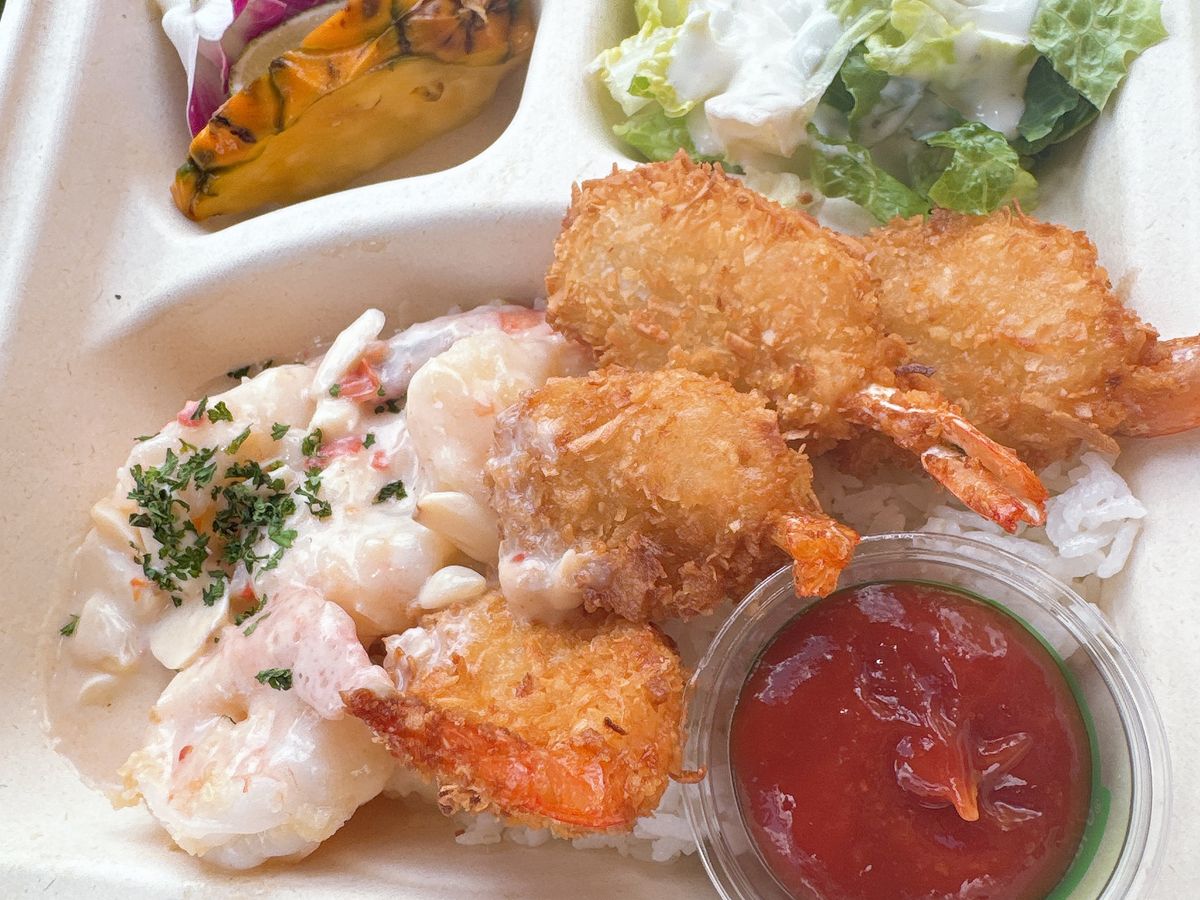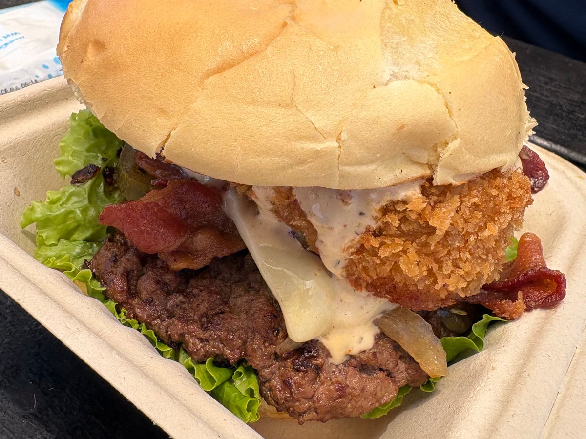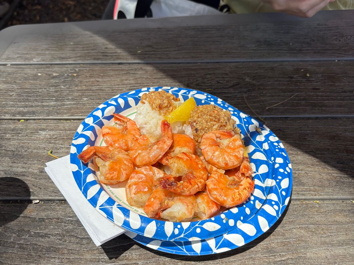 ランチもジョバンニのガーリックシュリンプだけではなくて、いろんなフードトラックがめっちゃあるのでいいです。うちは娘がピザ、私がシュリンプとポキの丼、パパは写真のデカいバーガーでした。