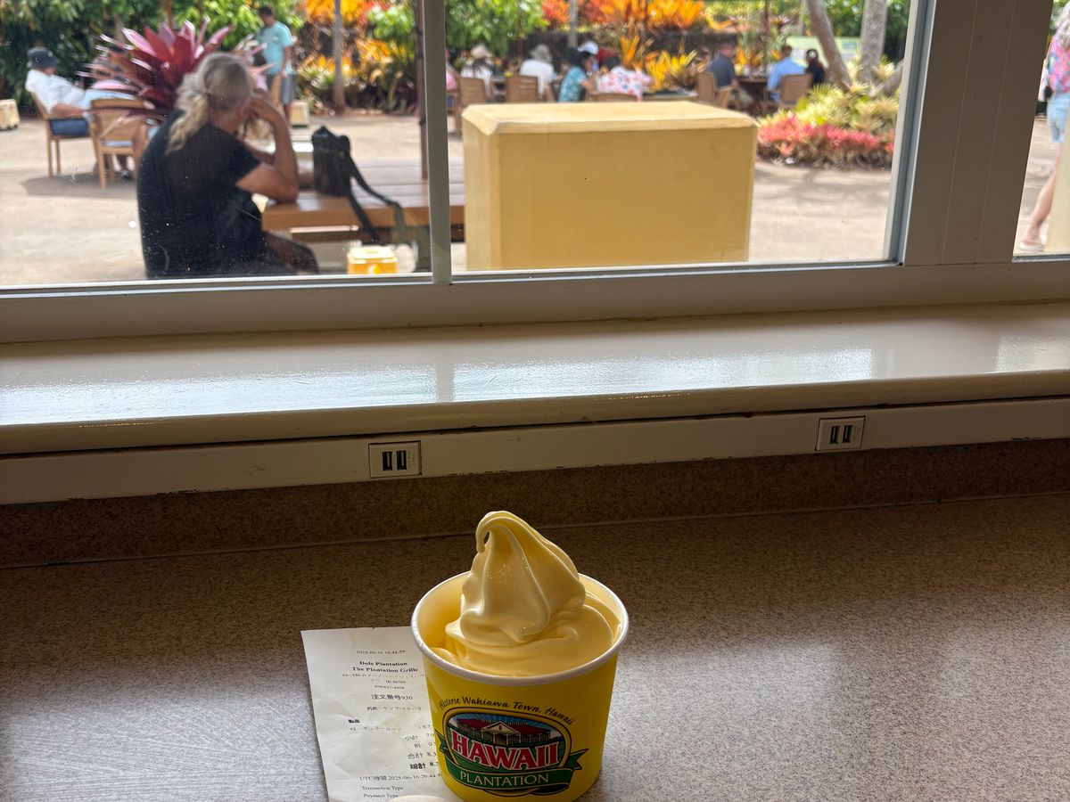 迷路でたくさん汗をかいた後は、パイナップルソフトを堪能しました。購入には長蛇の列を待たないといけないため、なるべく早めに並んでおくことをお勧めします。
