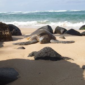 ノースショアのビーチでウミガメウォッチングにもチャレンジしましたが、この日は波が高くて浜辺に上がってくる奇亀はいませんでした。。