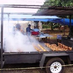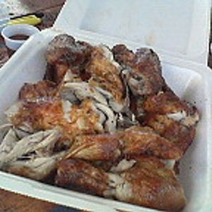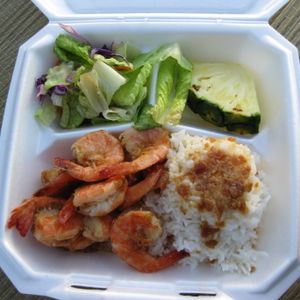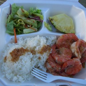 その後お昼ごはんですが、車内でオーダーを取ってもらえます。私たちは女性二人だったので、フリフリチキンのハーフ、カット済み、6ドルひとつと、エビバーベキュー味12ドル一つ(ご飯が付いてます)を買って、分けました。量はちょうどでした。