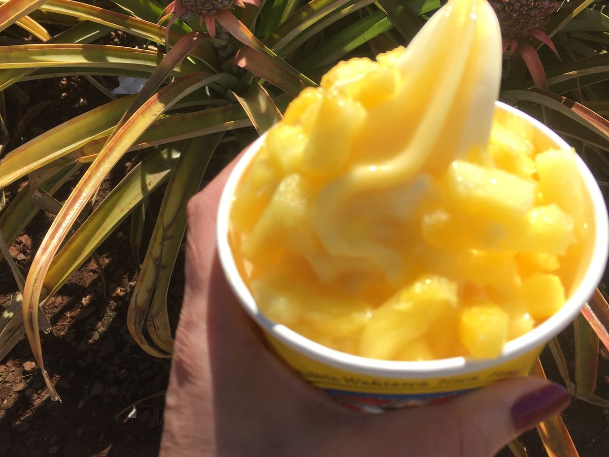 ドールプランテーションのパイナップルソフトクリームは絶妙でとても美味しい!大きいので一つを母とシェアしました。