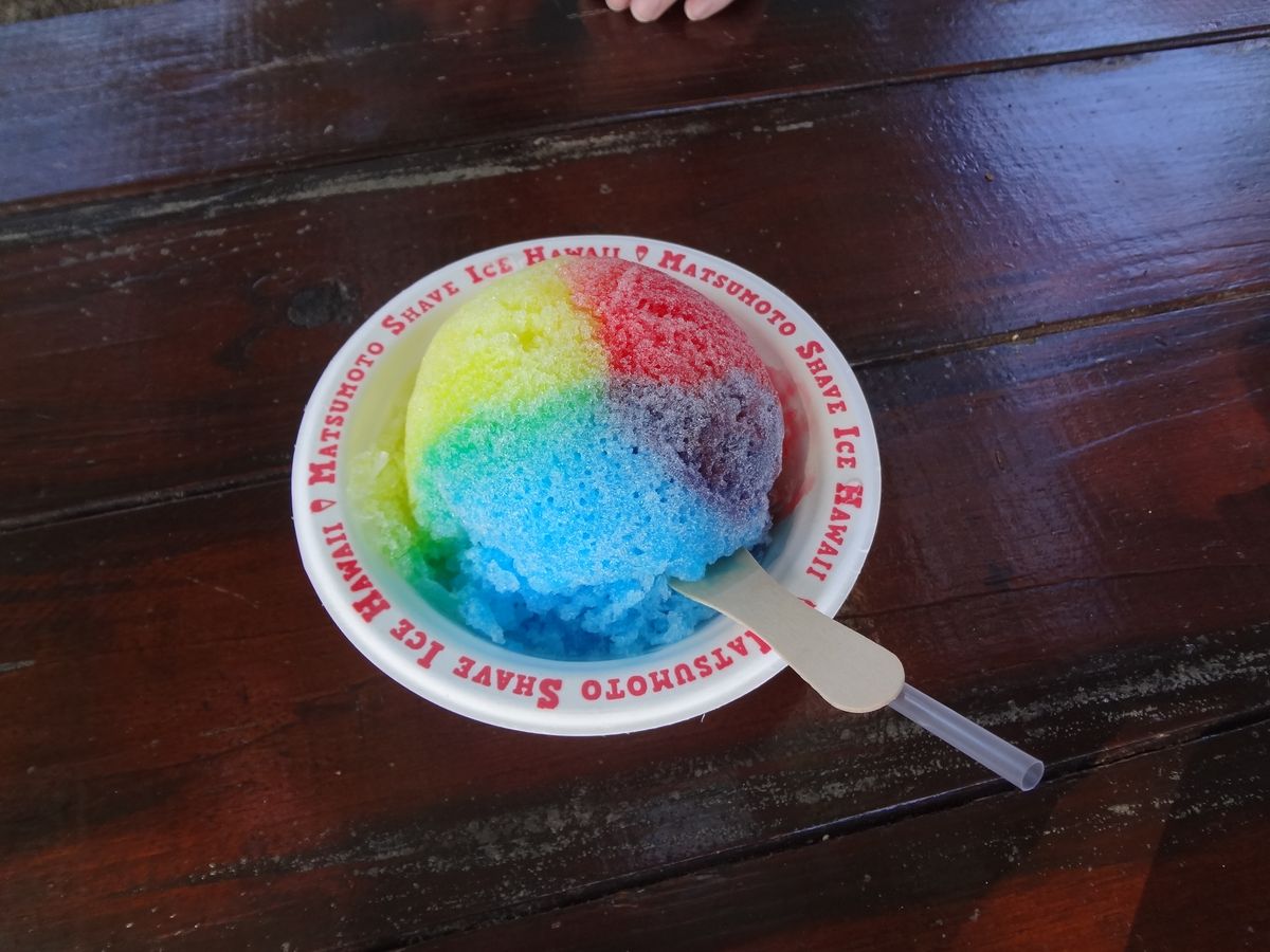 ハレイワではガイドさんオススメのカマロンのガーリックシュリンプ、松本シェイブアイスのレインボーアイスを食べました。
