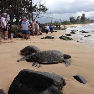 タイミング良く、ノースショアで甲羅干ししているホヌさんに出会えました。