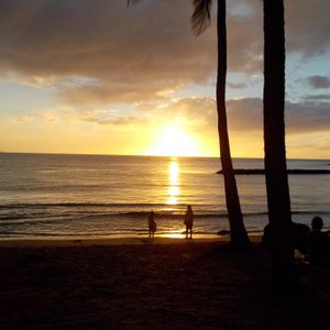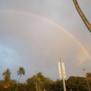 はとバスみたいにオアフ島の名所巡りみたいなツアーを探して結局これにたどりつきました。ガイドさんは親切で、期待通り、地元の人でないと分からないようなポイントを裏話を交えながら次々と案内してくれました。ガイド本に載っていたドールのアイスクリーム、マツモトのシェイプスアイス、ガーリックシュリンプも3人でシェアしながらちょっとずつ食べれて満足です。カメにも会えたし、夕陽も見れました。夕陽の写真を撮っていると、奥さんが「後ろ!!後ろ!!」と叫ぶので、振り返ると大きな虹が出てました。