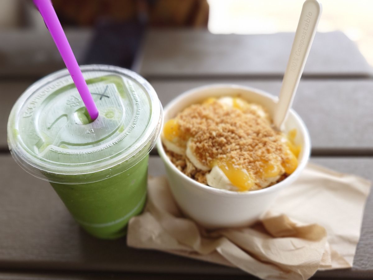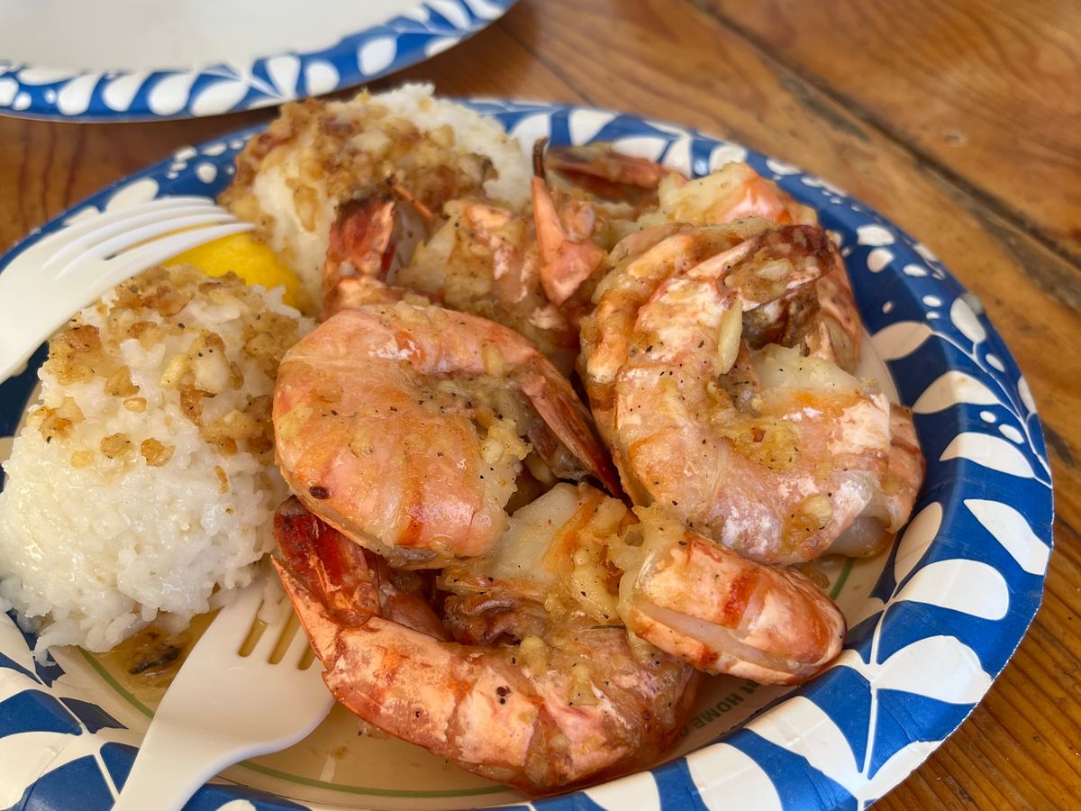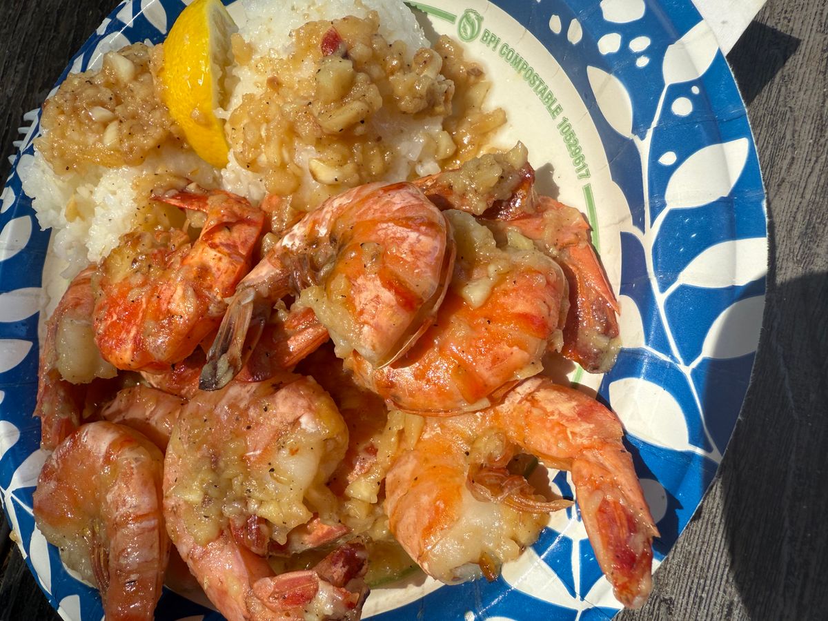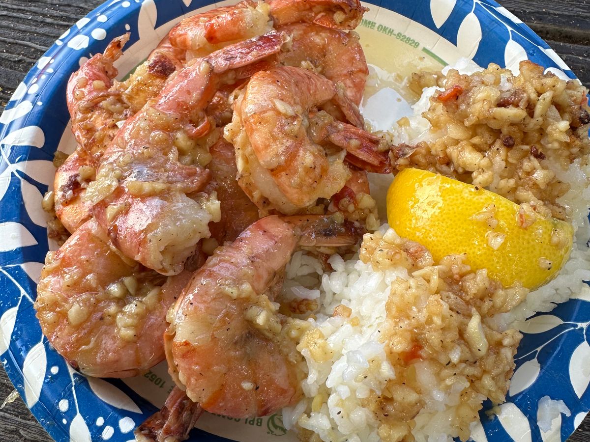 東周りのツアーでカフクファームのハワイ産アサイボール、ロミーズは大きなエビのガーリックシュリンプ。