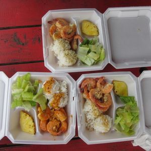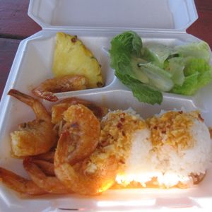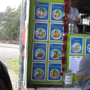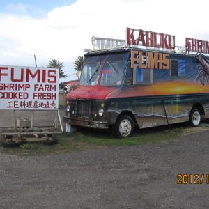 driver兼guideは日本人、このひと余計なおしゃべりはしない、ポイントは抑えてる。 なかなか日本人向けのガイドブックやナヴィでは載ってない、穴場spotを心得てる。 俺的には良い親爺だった。 north shore観光で外せないのはエビ。 ここも誰でも知ってる某rakugaki food truckではない。 知られざる???トラック。 Locos &Americans only 日本人は我々4人だけ。 韓国も中国も一人としていない。 写真載せてるので、参考にして。 オーダーして番号札渡されかなりの時間待たされたが、待つだけのことは十分ある。 旨い・reasonable price簡素ではあるがテント張りの下にイスとテーブル水道が引かれてる。 残念ながらビールが置いてないので呑んべーには辛いかも。 隣に日本人経営と思しきトラックがあるが客0。 そこを立ち去るまで一台として車入って来ず。
