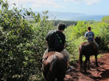 肝心の乗馬ですが、90分もあっという間。マンゴーやパッションフルーツの木や、色とりどりの花が咲いている木々の間を抜けて行ったり、馬の背からノースショアの海を眺めたり。