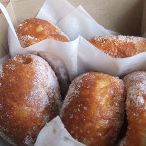 アツアツ揚げたてのマラサダを食べながら、ガイドのサカイ氏に写真を取ってもらう。