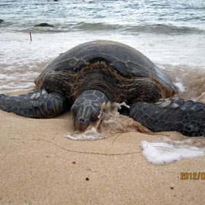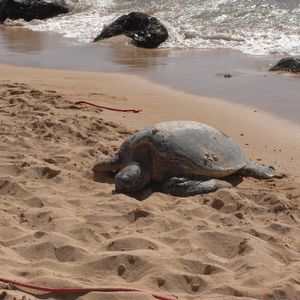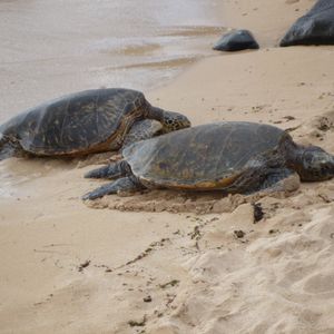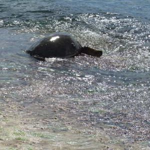 天気は快晴で日立の樹~Dole Plantation(生絞りたてパインジュースは果汁100%最高の味)~ノースショアの海岸で運良くウミガメが上陸してました。