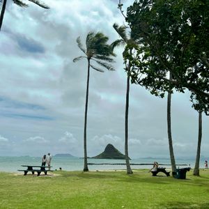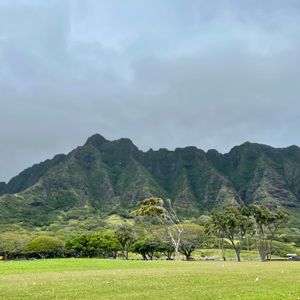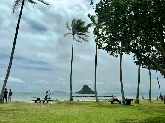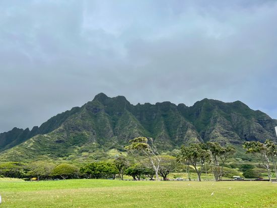 クアロアビーチパークは綺麗な青い海と、ハワイの緑の山を両方楽しめます。