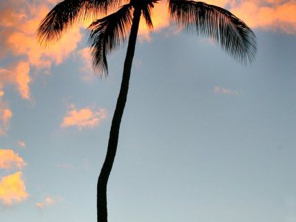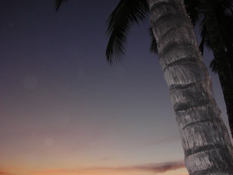 夕焼けなんて日本もハワイも同じ、と考えていたら大間違い。まず場面の設定がおもしろい。当地で買ったロコ弁当を砂浜で食べながら鑑賞するという趣向です。目の前では若者たちがカヌーやサーフィンに興じています。そういう中での夕焼けです。雄大な自然のなかで太陽が沈んでいくのですが、空気が透明なのと雲がほどよくあったので、言葉では言い尽くせない色彩になりました。