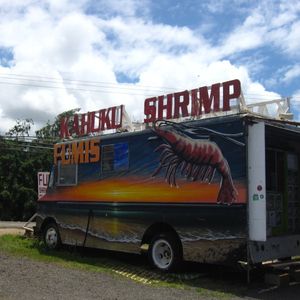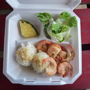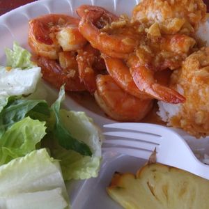 約10分のドライブでカフクのロミーズに到着。数組のお客様がいましたが、私たちのオーダーはスムースにでてきました。私たちはガーリック味、甘辛味、エビ盛りをお願いしました。ご飯が2山ついてきて結構なボリュームです。3人で2つでも良いくらいでした。ガーリックも甘辛もかなりおいしかったです。エビ盛りはでかいエビ(プロウンだったので5匹程度でしたが、小さな伊勢エビくらいあってふたが閉まりませんでした。裏の池でエビ釣りができるツアーもあるそうです。40分の昼食時間の後に出発。