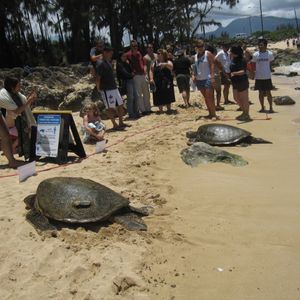 6 運よく2匹の海がめと記念撮影+1匹が泳いで上陸しました。