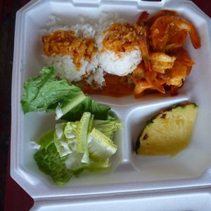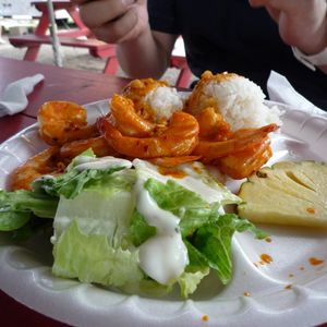 5 プリプリのエビのランチを食べました。味付けは、ガーリック味でとても美味しかったです。子供たちは、辛いガーリック味を食べましたが好評でした。とうもろこしも食べましたが、日本と比べると小ぶりで硬くイマイチです。