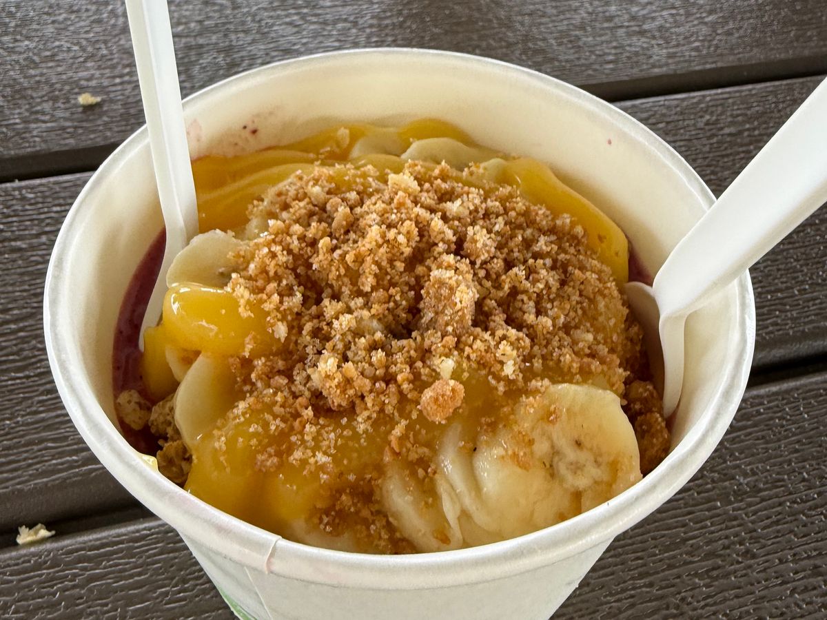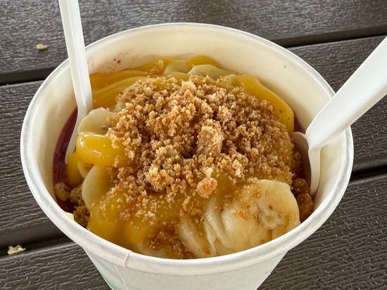 朝早く、ダイヤモンドヘッドの頂上まで30分ほど登りましたが、日の出待ちの登山者で頂上は大混雑。すぐに下山してKCCマーケットへ向かいます。マーケットではズッシリと重いアサイーボウルを食べました。よく冷えていて、美味しかったです。
