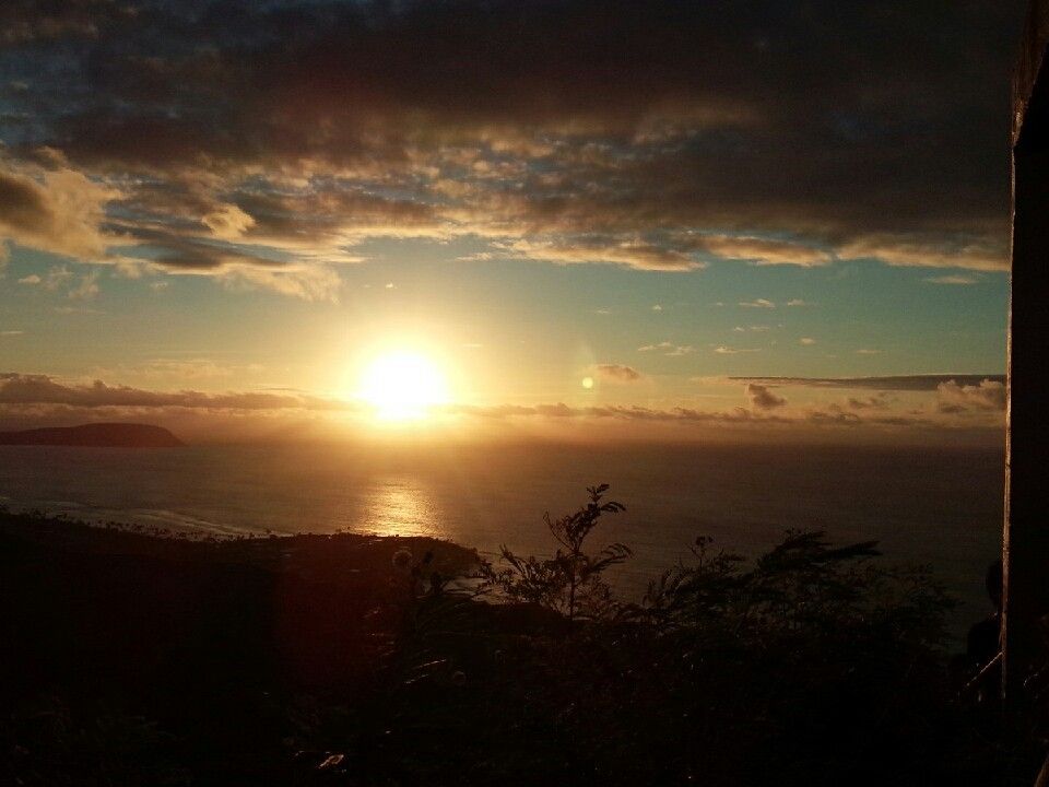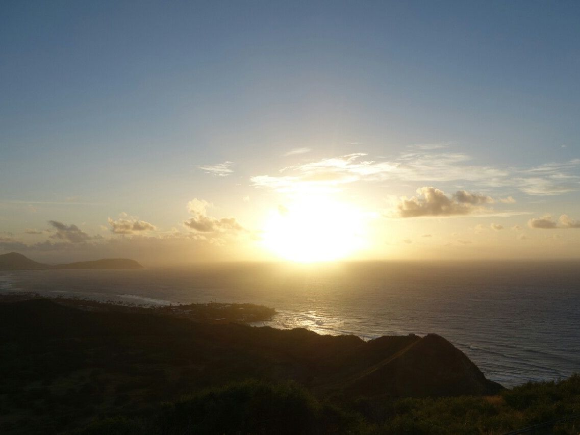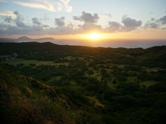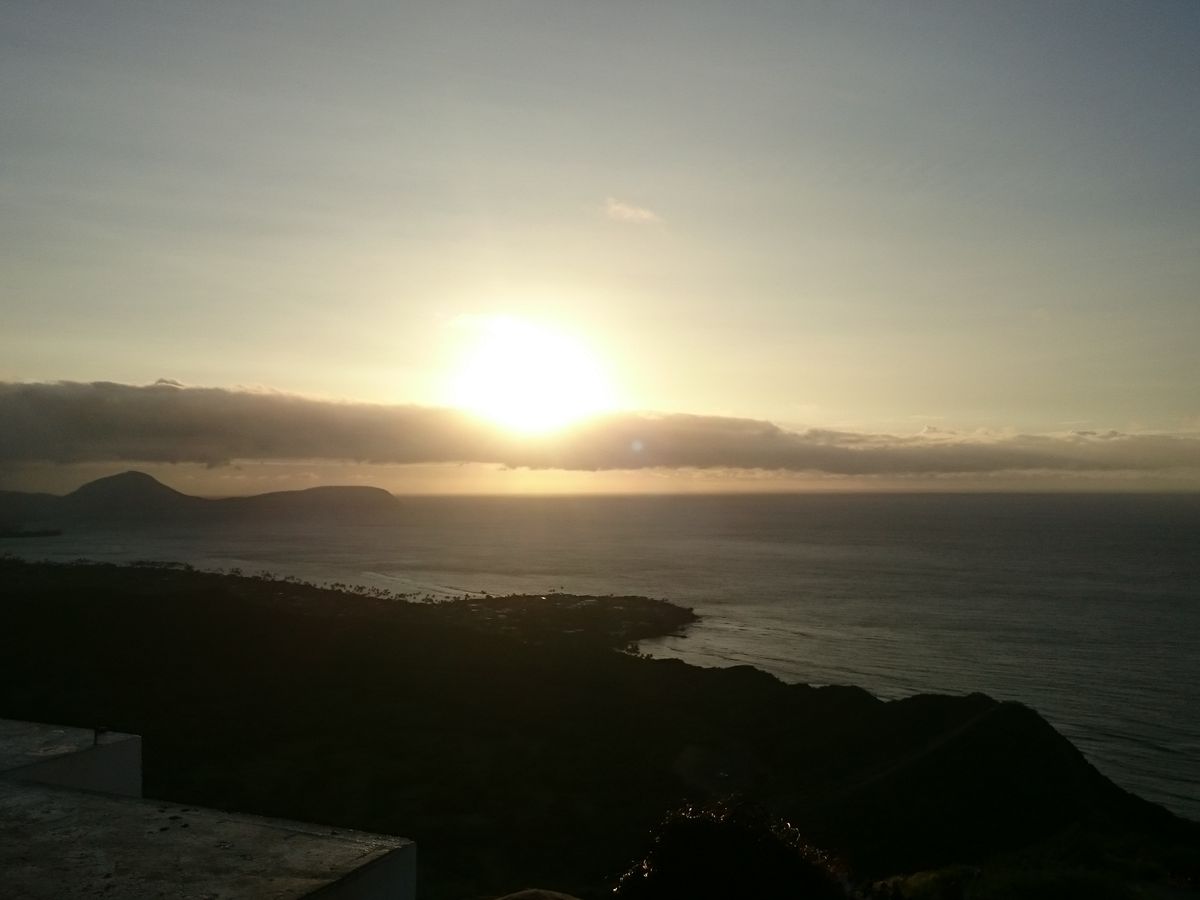 バスでダイヤモンドヘッドのゲート前に着くと、ゲートが開くまでに時間があるということで外に出てもいいという案内があり、懐中電灯を渡され外に出ました。外は早朝で真っ暗だったのですが、空を見上げると満点の星空で、また、下を見下ろすとキレイな夜景が広がっていて、とっても感動しました!時間があったので写真も撮りました!その後、ツアー客を集めて、日本人ガイドさんから注意事項などの説明を受け、6:20くらいに出発しました。山道は、急な階段などもあり、結構ハードです!片道30分くらいかかりました!でも、天気もよく空気が澄んでいて、頂上に着いたときは達成感もあり、とても気持ち良かったです!そして、頂上にて朝日が昇るのを待ちました!朝日も無事に観れ、とても感動しました!7:20に下のゲートに集合でしたので、しばらく朝日を眺めて写真を撮り、来た道を戻りました。