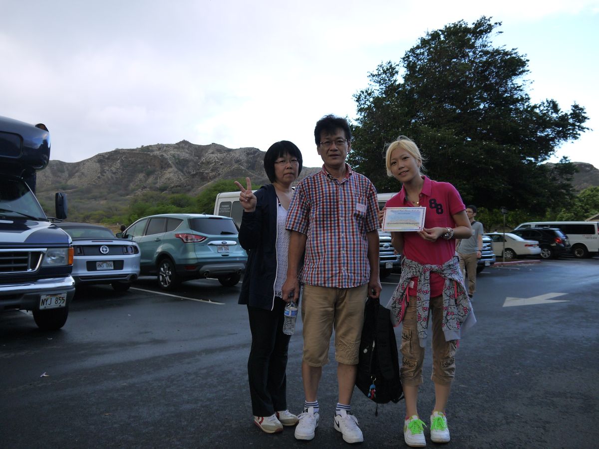 最終日の早朝に参加しました。5時半にホテルを出発、6時開門まで駐車場のバスの中、日の出は残念ながらバスからの眺めとなりました。ダイヤモンドヘッドで日の出を見るにはもう少し日の出が遅い時間でないと難しいかな~。ハイキングの所要時間は1時間10分位、残念ながら70代の母は登頂前に敗北宣言、60代の義父母は一生懸命私達に食い下がり登頂し降りてきました。物凄い人なのでかなり焦った山登りでした。山頂からの景観は最高でした!!