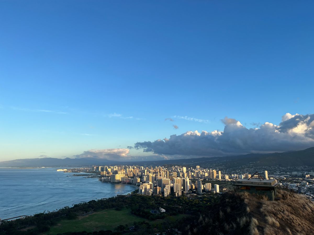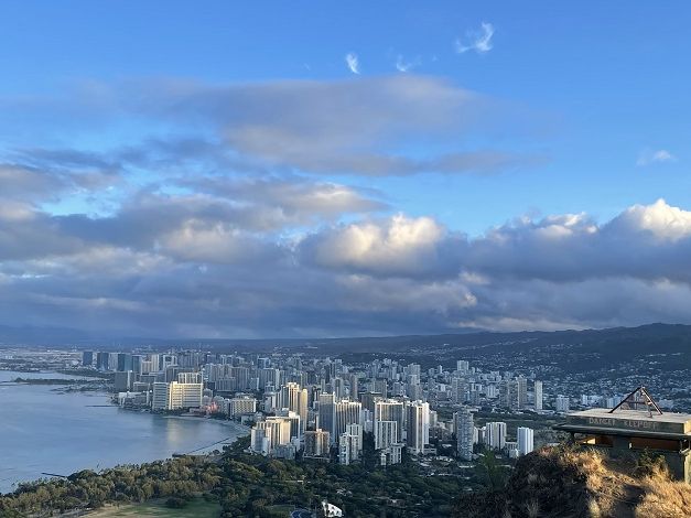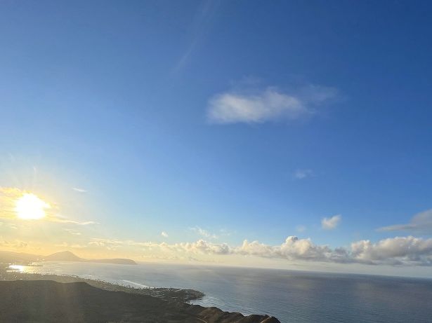 6時20分の日の出には間に合わなかったのですが、頂上に着いた時には風が気持ちよくて太陽が照らすホノルルの街並みがとても綺麗で文字通り疲れが吹き飛びました。