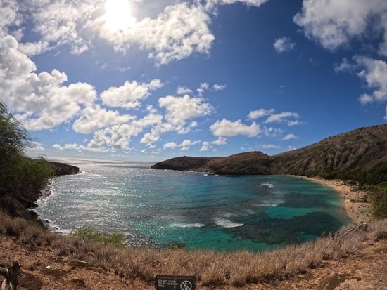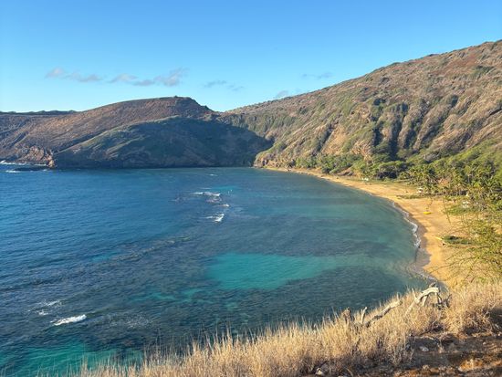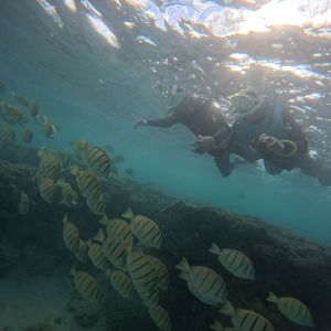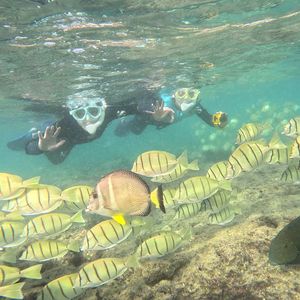 海外でのシュノーケリングは初体験だったので、日本語ガイド付きという点でとても安心でした。また、普通のビーチと違い、入場制限や入場時の啓発ビデオ視聴が義務付けられているハナウマ湾ならではの体験ができました。ウミガメとの遭遇も3回もあり、レンタルしたカメラでもいい写真や動画を撮ることができました。また、サンゴ礁の魚たちはサイズが大きくて、見ごたえがありました。シュノーケリング自体は正味1時間ですが、50代半ばの私たちにとってはちょうどいい負荷だったと思います。本当に楽しかったです!11月ということで、ガイドさんのアドバイスにしたがいウエットスーツを着用したので寒さも感じませんでしたし、事前に酔い止めを勧められて服用していたので、波が高くても気分が悪くなることもありませんでした。ガイドさんの適切なアドバイスがとてもありがたかったです。