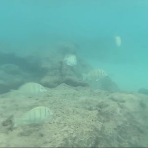 右側の岩礁に色んな魚、