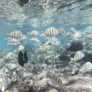 サンゴが近いので、ビキニなどよりもラッシュガードのほうがいいです。曇りでしたが、海の中は関係なくカラフルな魚がいっぱい見れました!ただ日陰がほぼゼロなので日焼けを気にする人は要注意です…
