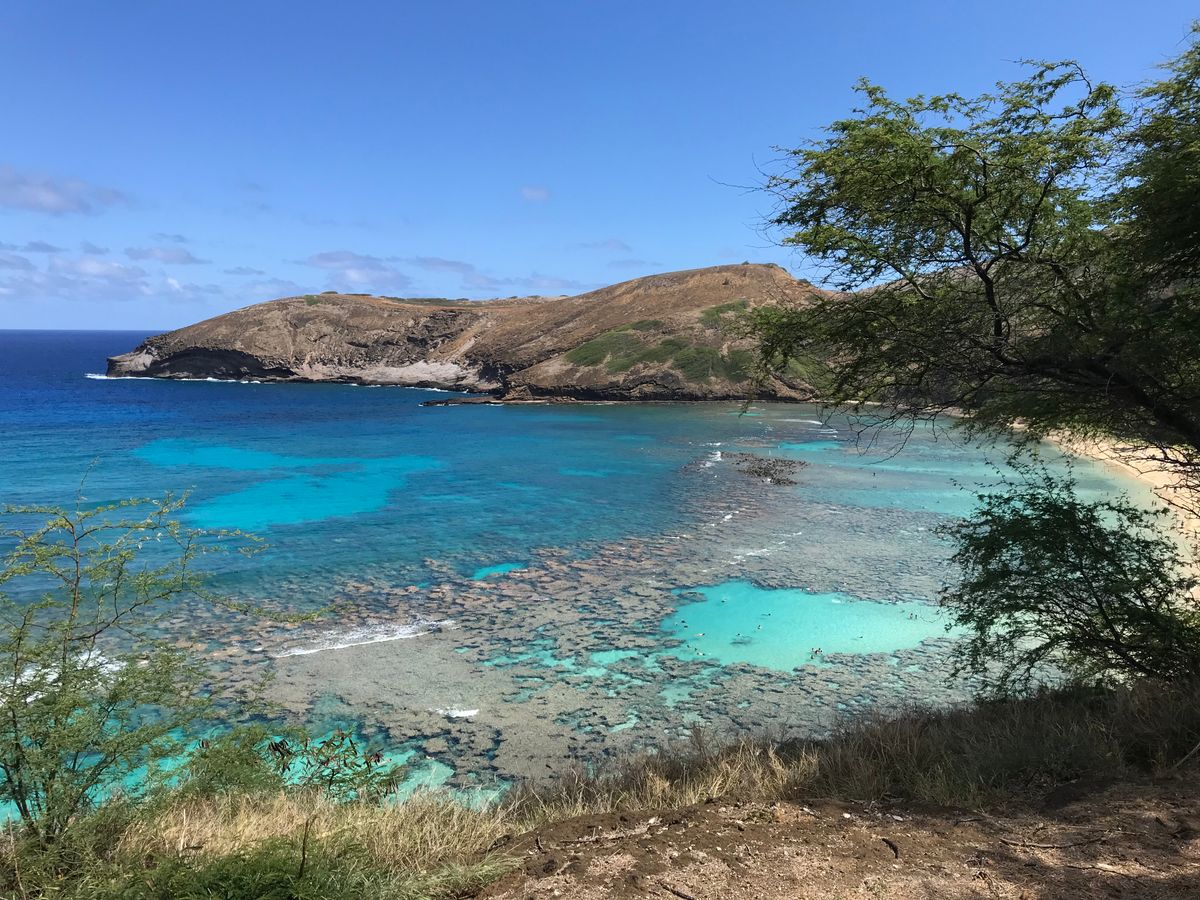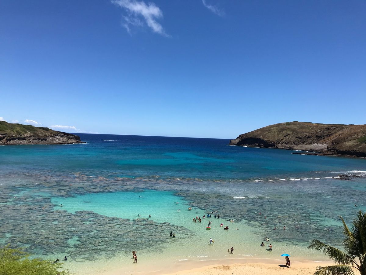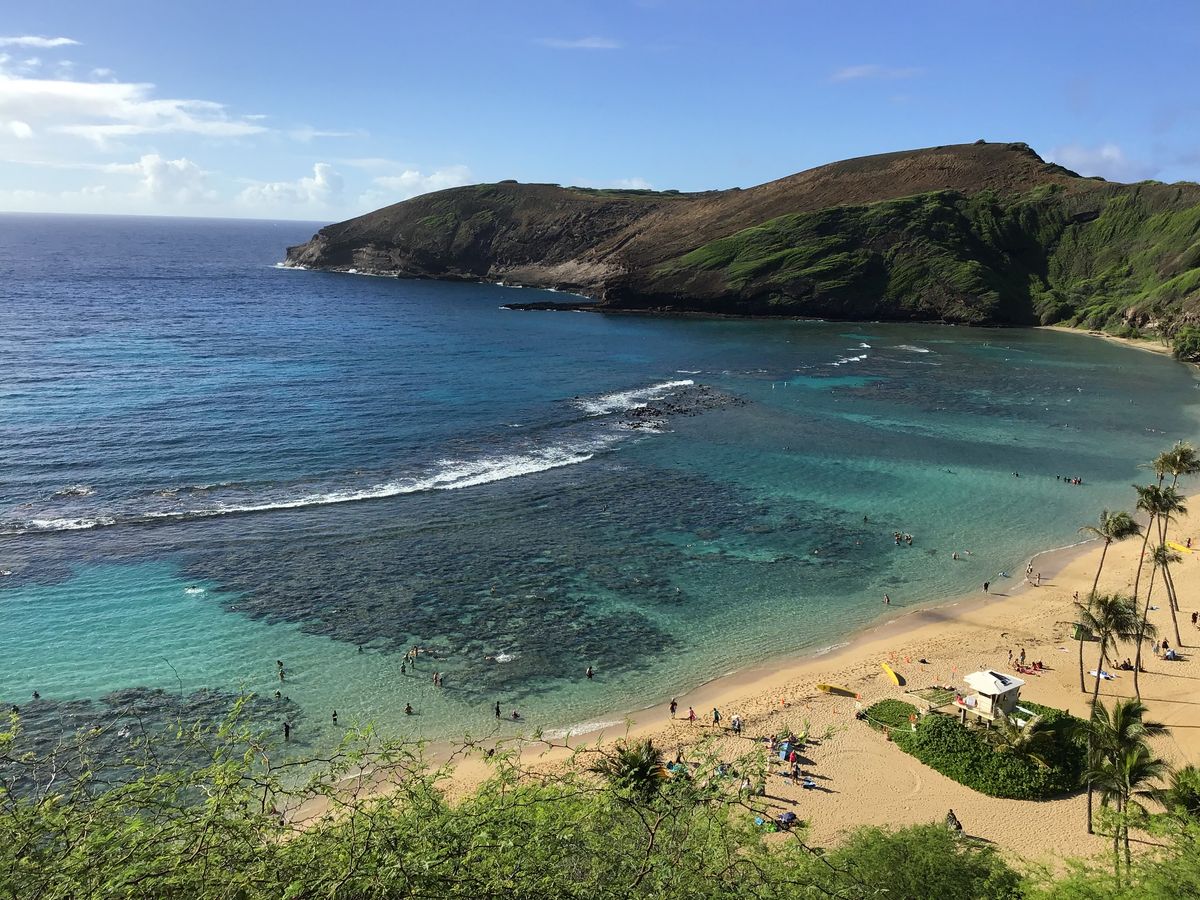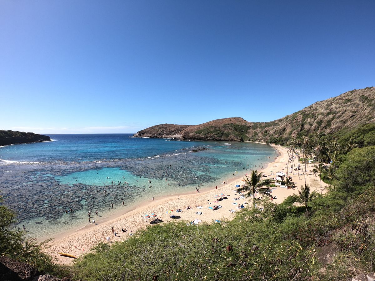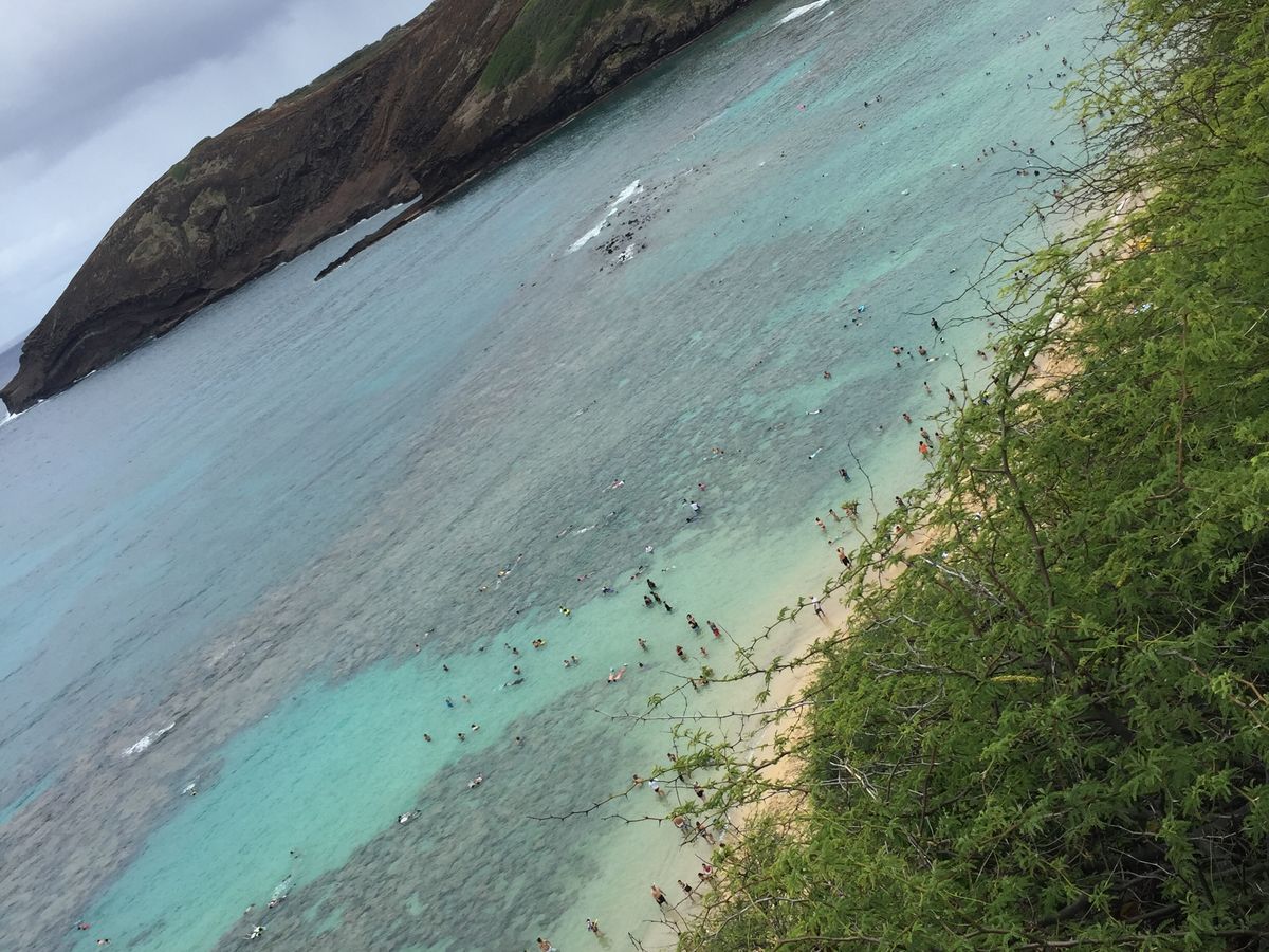 ハナウマ湾は激混み!という触れ込みで、ツアーを手配しましたが、私の体験ではレンタカーで行ける人はレンタカーでも、いいのでは?と思ってしまいました。それなりに人はいたけど、激、というほどではなかった。ハナウマ湾自体は同行した妻は大変気に入っていましたが、私は沖縄の離島が100点だとすると、よくて70点ぐらいかなあ。というカンジ。サンゴが圧倒的に少ない。でも、充分きれいなところですよ。